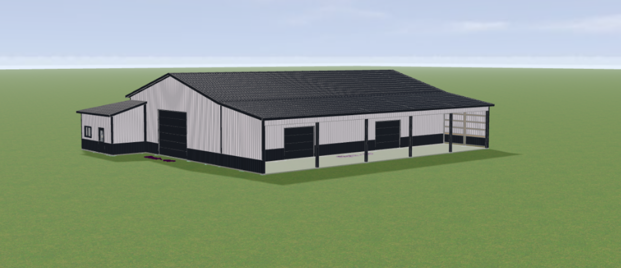 can you make this look more realistic as if taken by a camera add some rural trees and some grain bins in the background add some cows and a fence under the open lean to