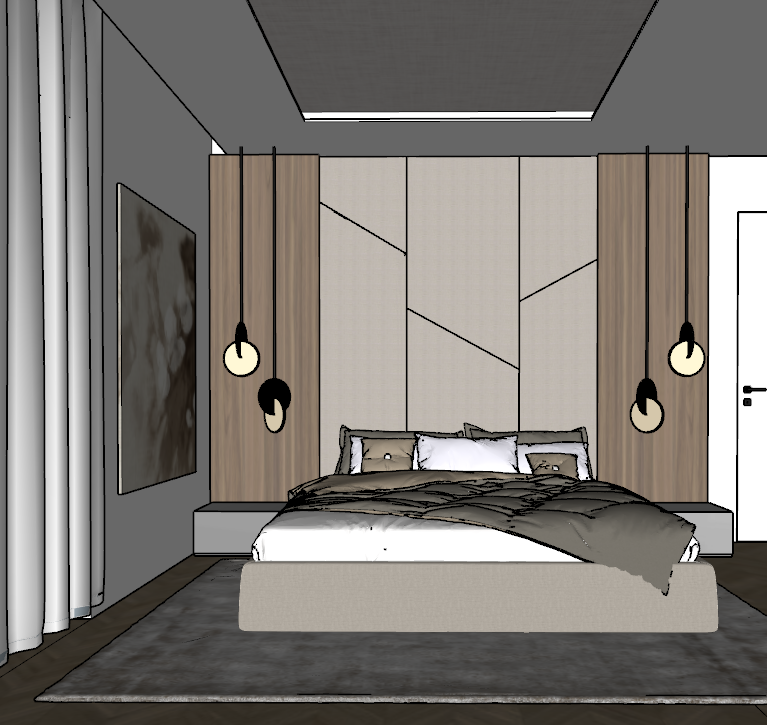 render dont change anything besides next comments nightstands mirror bronze grey dont change shape panels behind bed in textile wood panels on the left and right of the bed with indirect light carpet as on attached photo