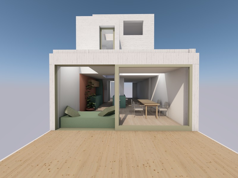 interior skylights beige window frames plants on the roof white bricks facade more interior lighting grass garden white bricks front facade