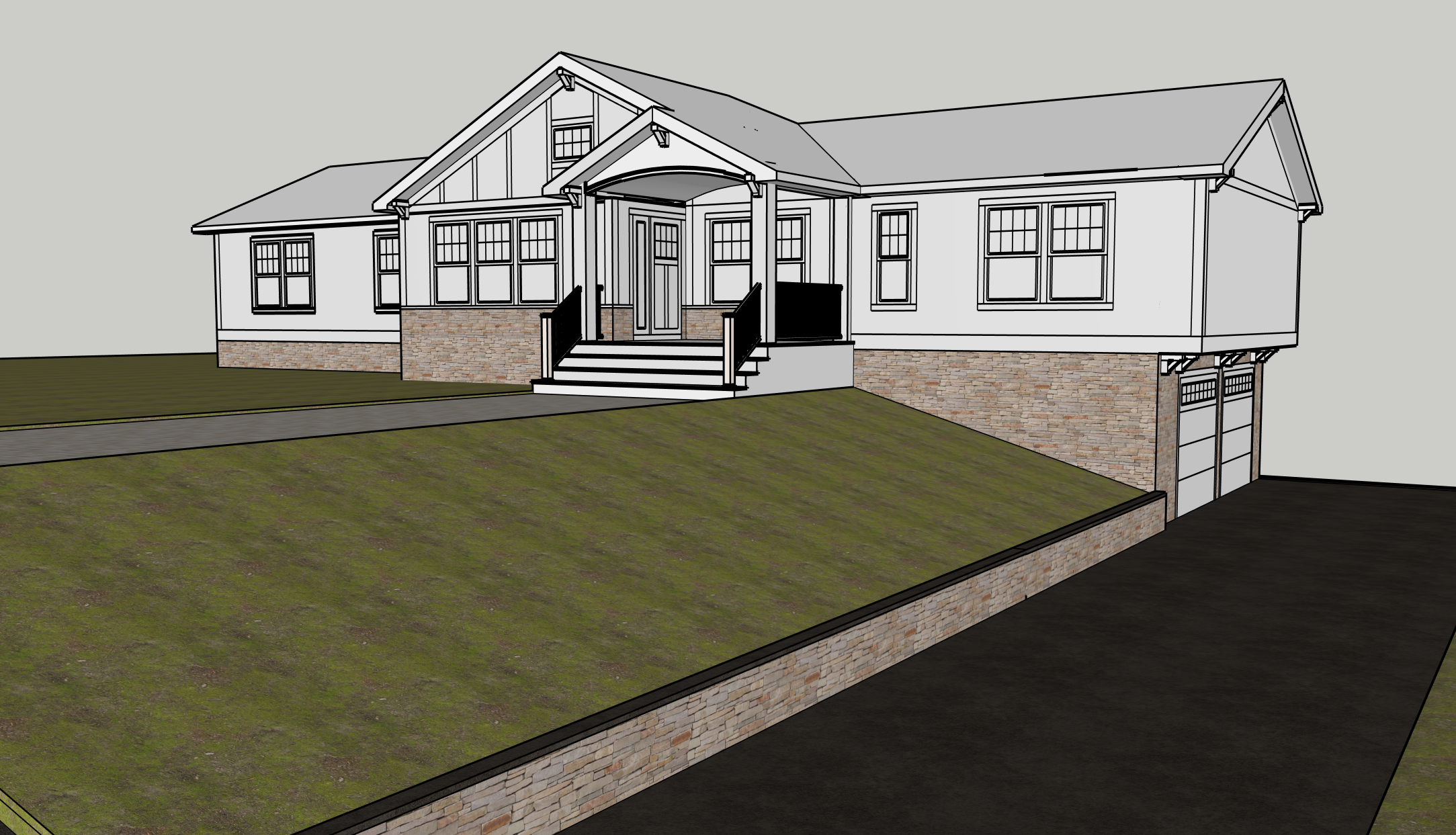 white trim and off white clapboard siding white cottage mullions grey tone stacked stone veneer in place of the brick grey tone patio pavers shrubs bushes and flowers near the house trees in the background white wood furniture on the covered porch and people placed in the image to show realism and scale keep the image as close to the original as possible add a walkway from the middle of the stair and connect it to the driveway the walkway should be a grey paver