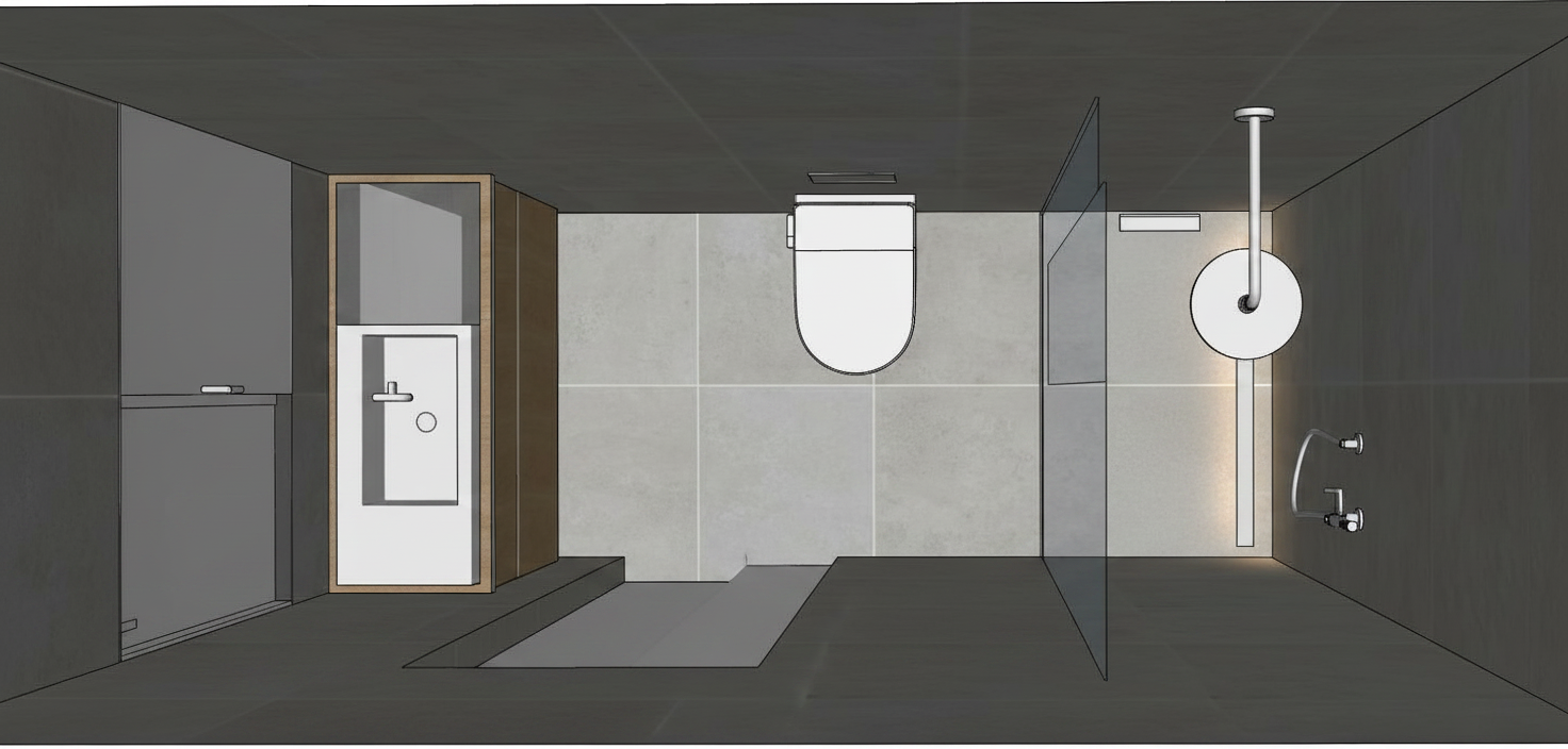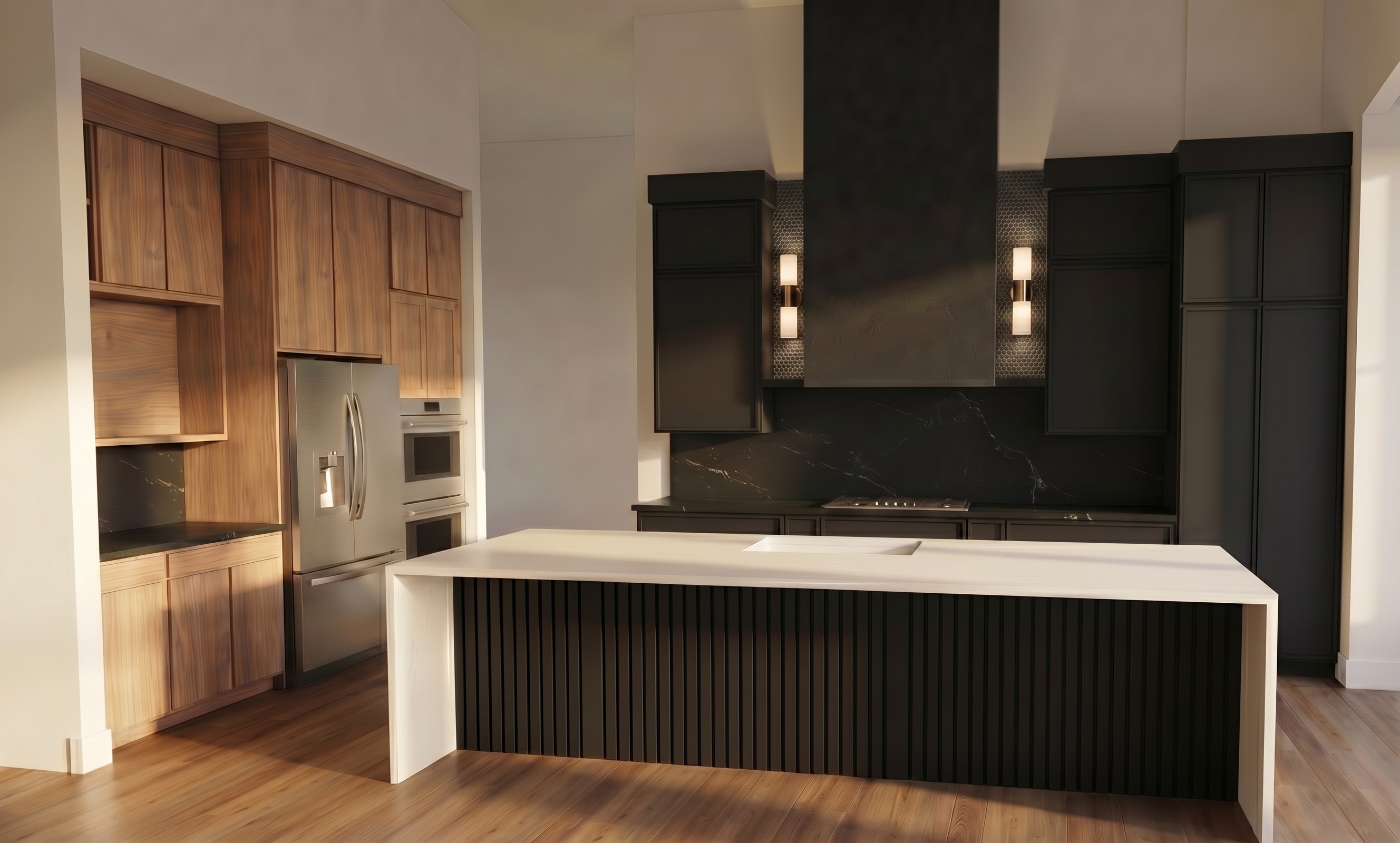 change the penny tile area above the vent hood shelf only and the wall area on that range pantry wall only to a black leave the full height quartz woodcroft by cambria backsplash