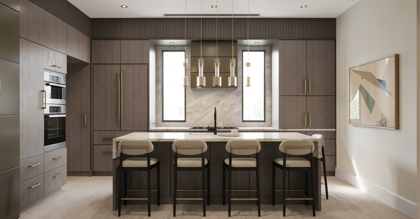 clean modern architectural exterior home rendered in cinematic vibrant golden hour lighting with blue skies and sparse clouds in the sky modern with heavy timber architectural style and reflections off of the windows select grade wood cedar siding green manicured landscape around structure with hedges and gardens and patches of grass black standing seam metal roof prominent cinematic small river with small rapids and big fir trees surrounding the house in the background high fidelity photorealistic visualization crisp shadow falloff refined facade geometry soft atmospheric depth premium architectural photography mood ultra clean composition and materials dark trim around windows concrete driveway leading up to the house lined with hedges