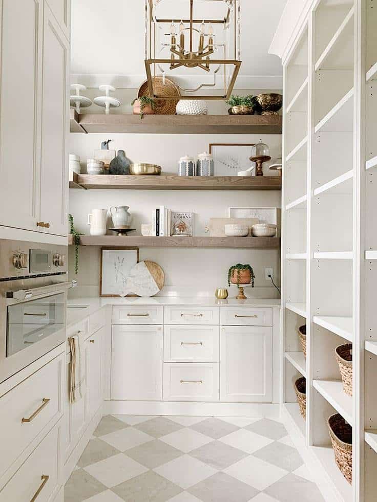 interior shot render a serene and elegant kitchen pantry with a light airy atmosphere the walls and cabinetry are a soft white creating a fresh clean look the shelving is made of rich light toned wood complementing the neutral tones decorative items include white and beige pottery a wicker basket jars of spices the floor is wood overall the space is organized stylish and inviting architecture