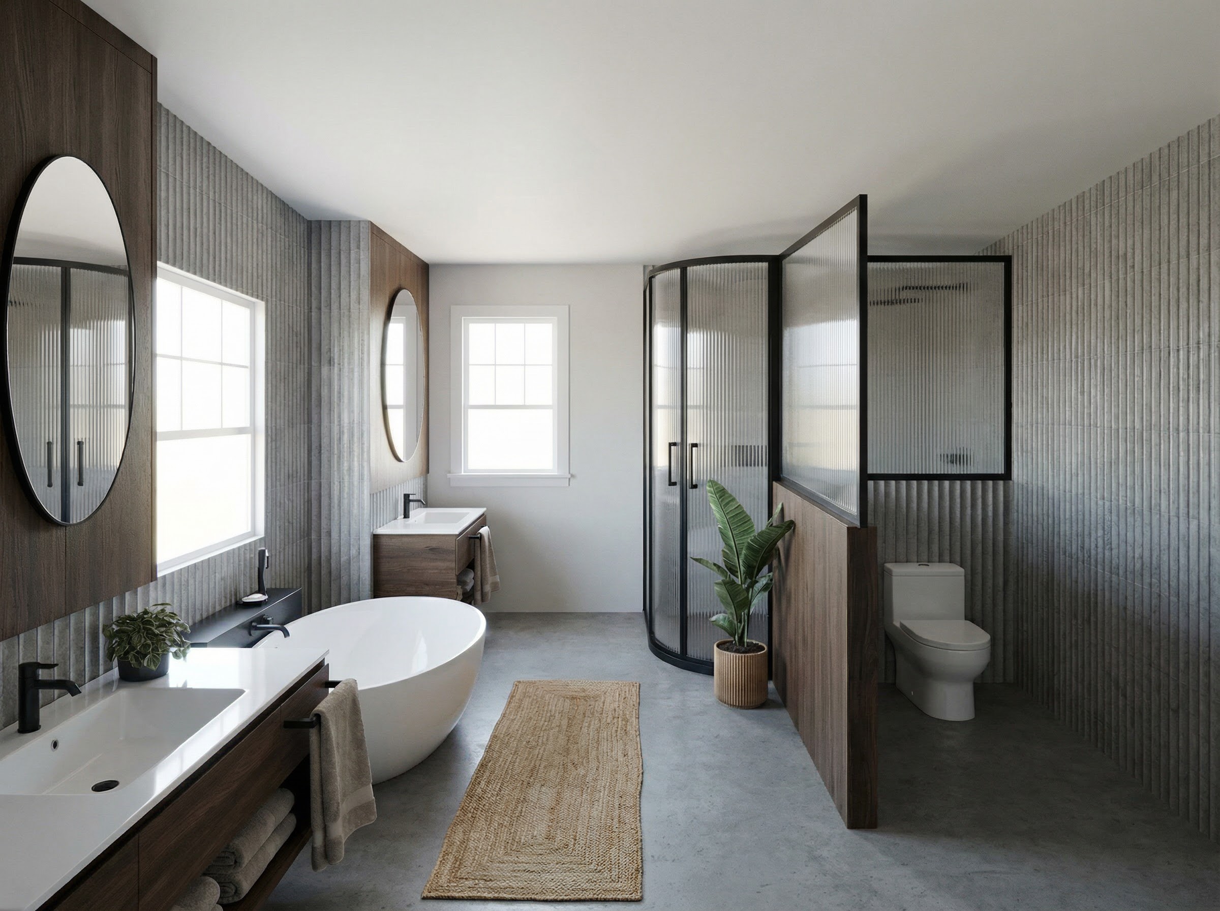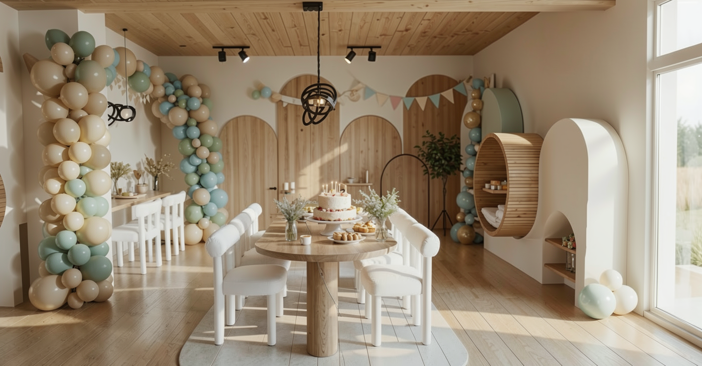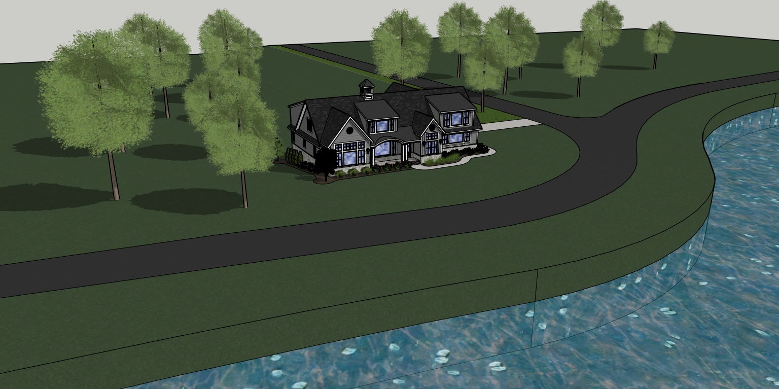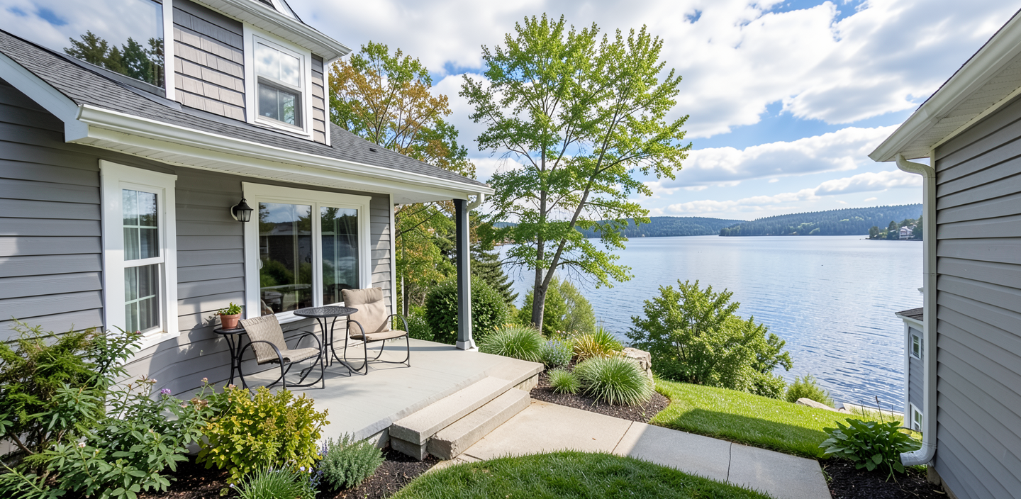 partly cloudy day some deciduous trees behind the house 2 chairs and a side table on the porch gray siding white trim white windows