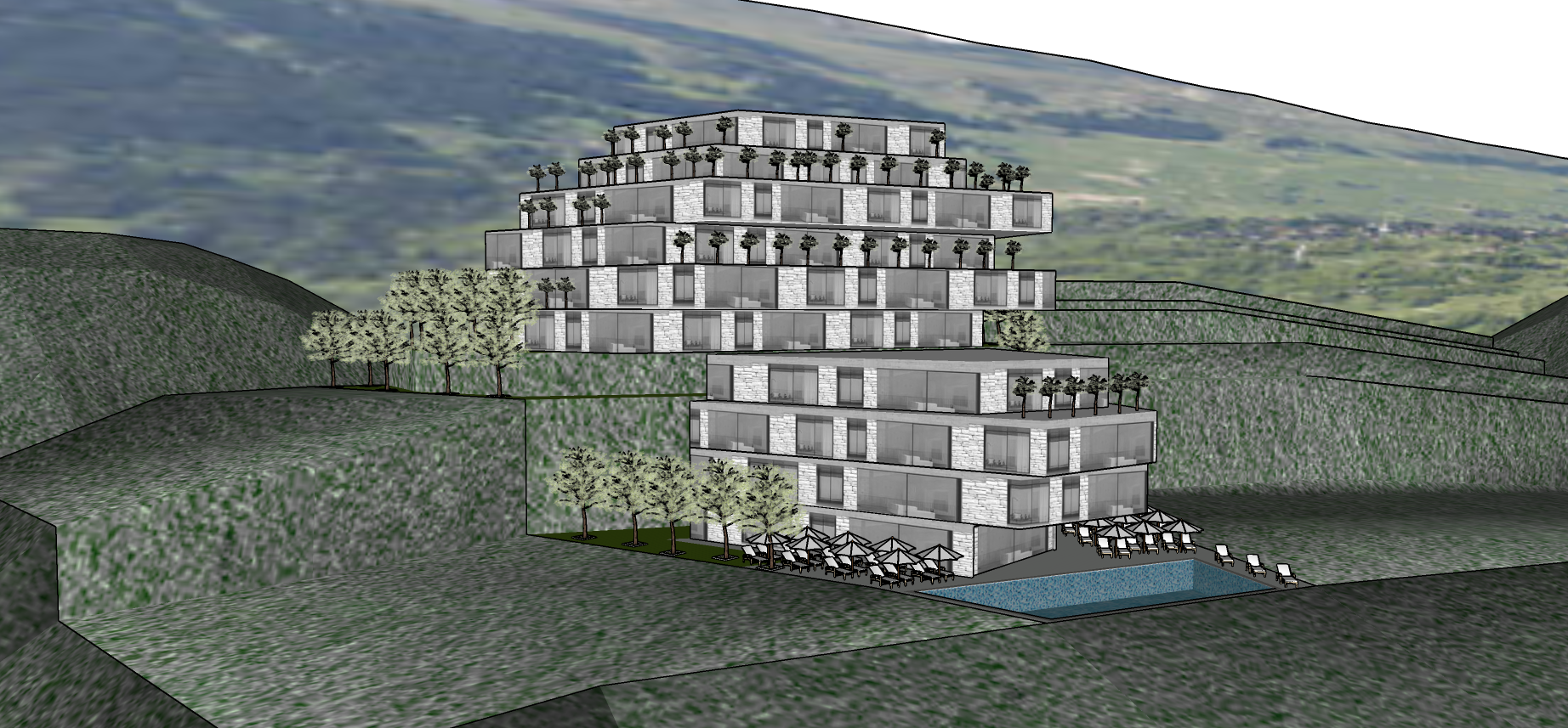 a serene landscape with terraced grassy hillsides vibrant green hues two modern minimalist white buildings with tiered structures a reflective calm blue pool in the foreground with stylish black patio umbrellas and chairs the scene overlooks a vast tranquil azure lake set under a bright crisp sky with the distant mountains casting soft shadows creating a peaceful and harmonious atmosphere