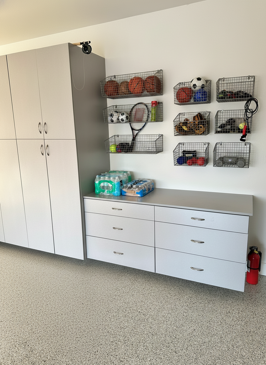 remove everything but the cabinets and restage this garage get rid of all the electrical on the wall and replace with wall mounted baskets of sports equipment for a garage get rid of the fishing rod and line on the top