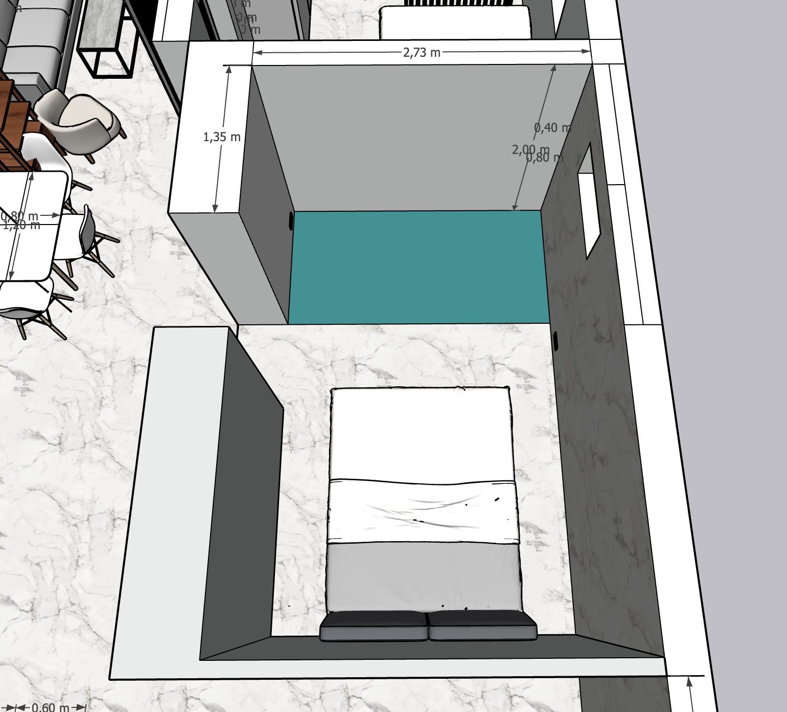archsynth prompt use the attached image as the base geometry and keep the layout exactly as drawn transform the turquoise floor area into a mediterranean boutique hotel bathroom connected to the bedroom suite dimensions must stay exactly the same width 273 cm depth 135 cm ceiling height 200 cm do not move walls or change proportions layout create a compact luxury bathroom full width walk in shower along the back wall 273 cm wall flush floor shower with linear drain ceiling integrated rainfall shower due to low ceiling height minimal frameless glass divider floating vanity with single basin style mediterranean boutique hotel interior inspired by ibiza and mallorca hotels materials warm travertine or light limestone tiles large format stone tiles on walls and floor microcement or stone floor in warm sand tones floating vanity in natural oak stone countertop basin brushed brass fixtures details recessed wall niches with warm led lighting large full height mirror above vanity concealed shower mixer seamless stone surfaces minimal luxury design lighting warm indirect led lighting hidden led strip in ceiling edge led lighting inside shower niches soft boutique hotel atmosphere important respect the exact geometry from the drawing do not change wall positions remove drawing lines keep the bedroom visible outside the bathroom photorealistic mediterranean boutique hotel style elegant warm and luxurious feeling lite archsynth triks som ofte gir bedre resultat ultra realistic lighting architectural photography wide angle interior lens luxury boutique hotel bathroom