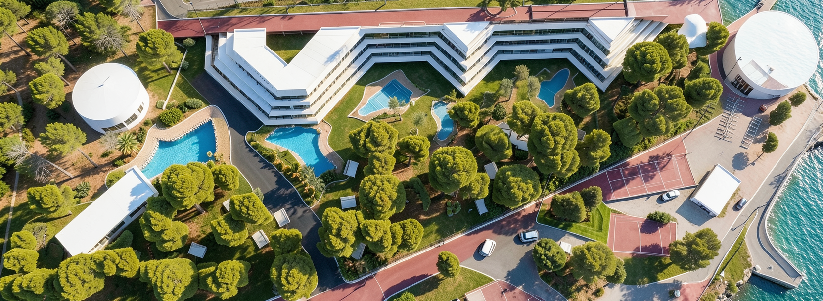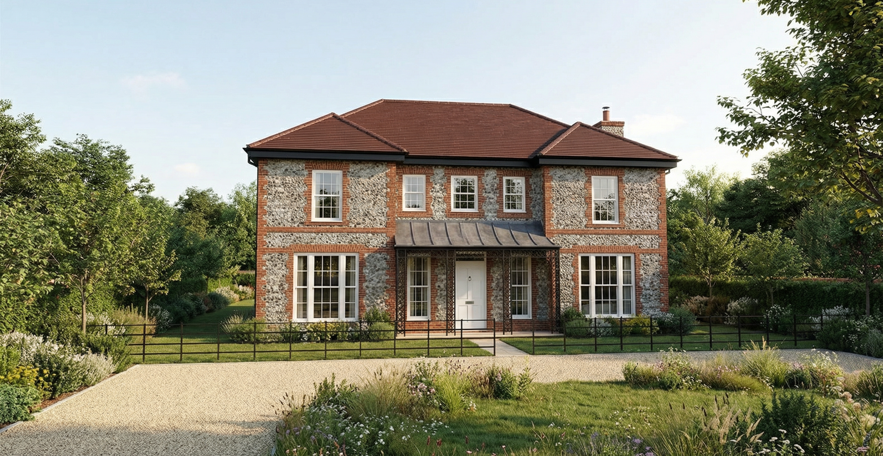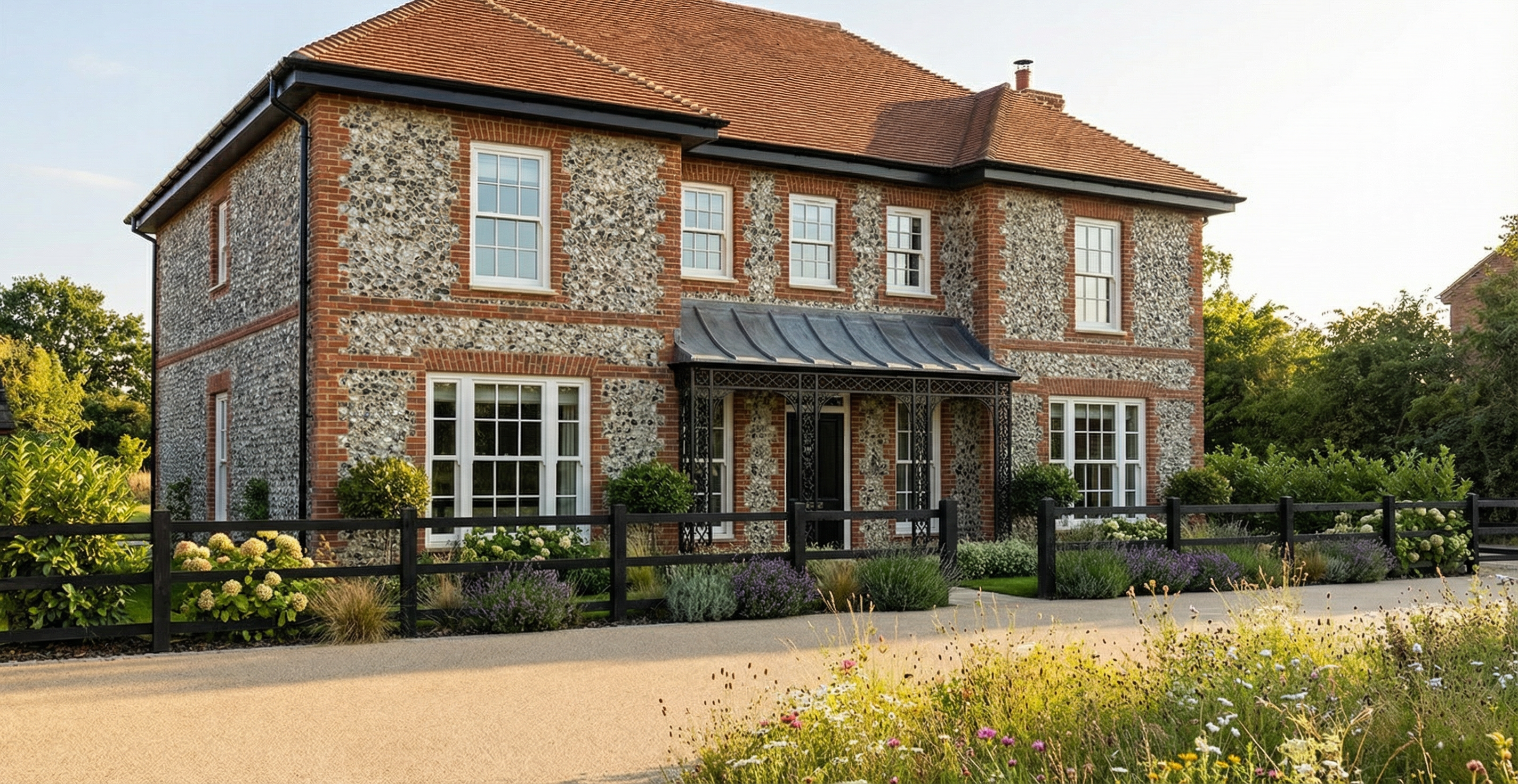 generate a hyper realistic visual of this exact image do not change the view the house on the left is traditional flint with red brick detailing white windows and black fascia and soffits the entrance detail is lead and wrought iron make the fence a black post and rail fence with a cream resin bound front driveway the planting is to look semi rural but manicured with some wild planting in the central grassed area make the image apriational and classy and dont change design or proportions or camera angle
