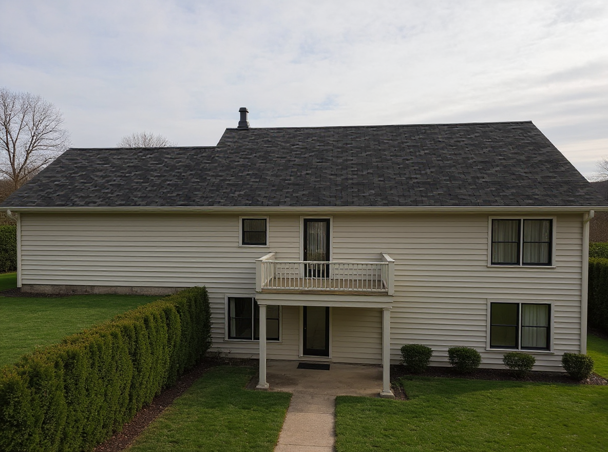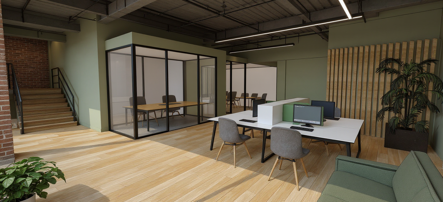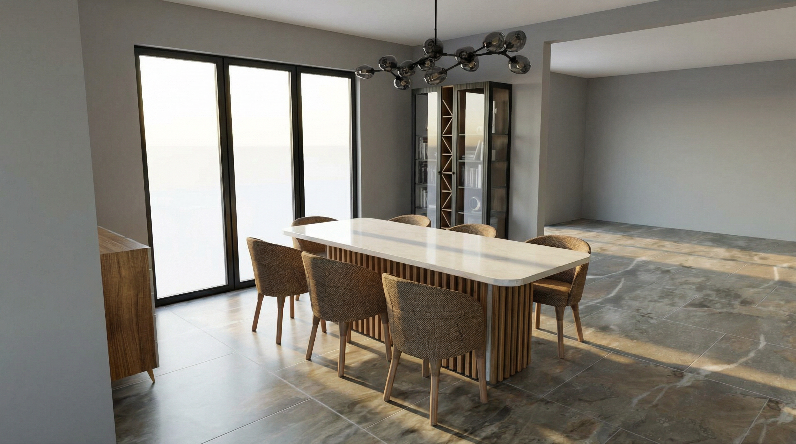 atmospheric style off white limewash wall neat off white lined linen elegant pinch pleat curtains honed marble shades and bronze arms on pendant dark khaki green rug in front of vanity with off white border satin paint finish on window woodwork view beyond to hills and water bronze texture on curtain rail yellow toned mid toned neutral on vanity no handles on vanity honed marble on vanity top polished nickel on taps dark stained pine boards on floor soft visible shadows soft slightly warm diffused light make curtains 40 fuller small irish expressionist landscape painting on wall above bath taps in natural palette editorial style for house and garden magazine
