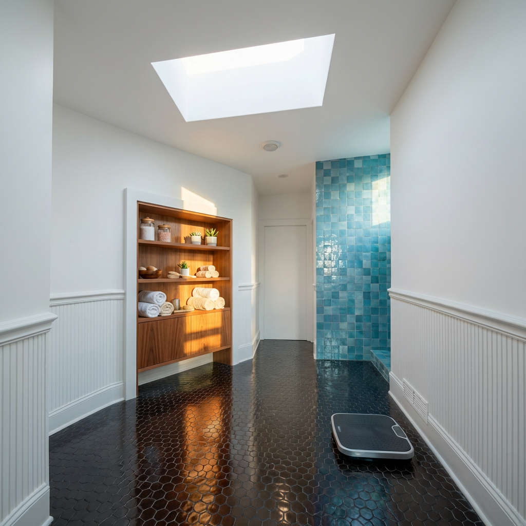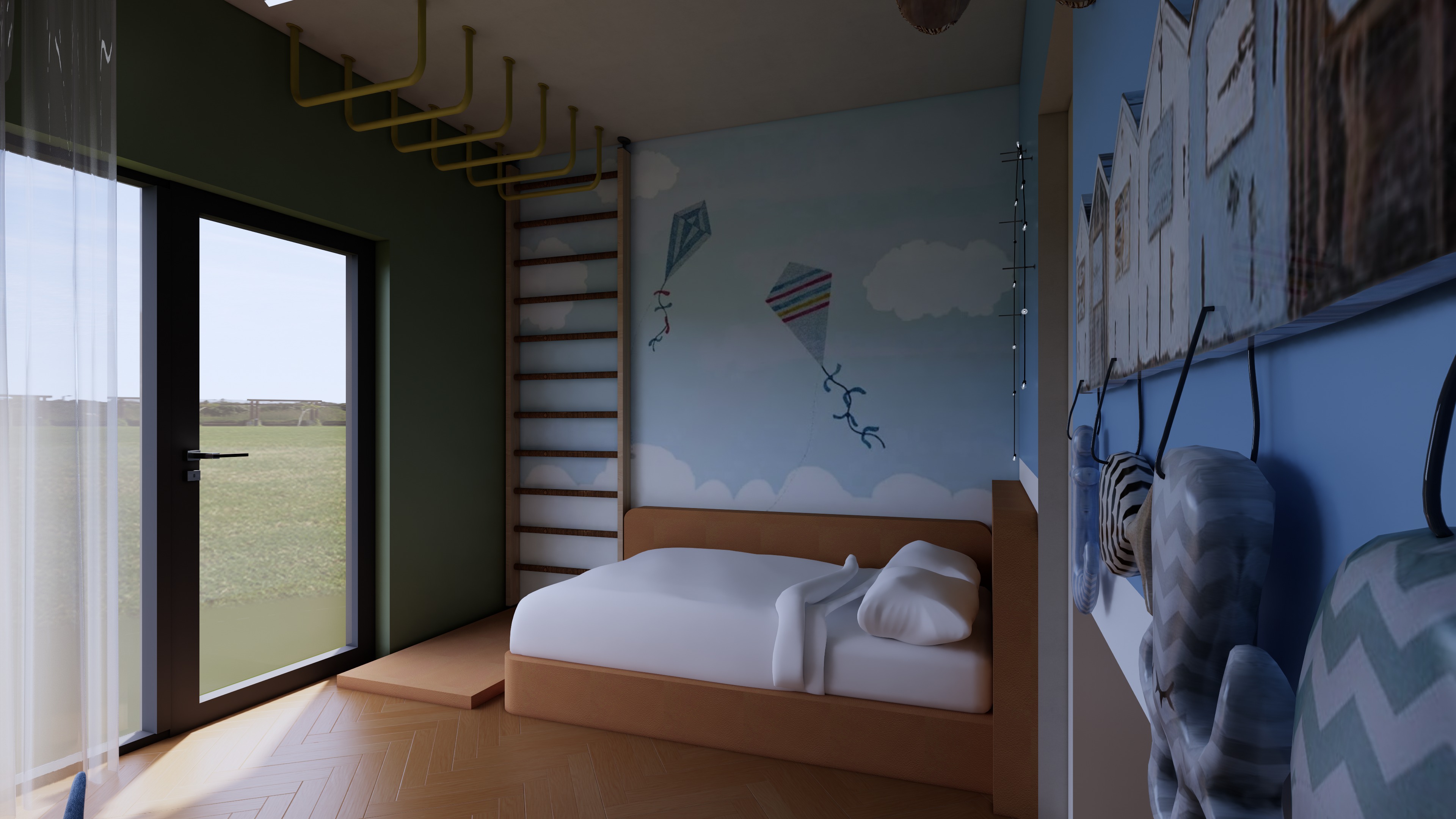 keep the exact same layout geometry proportions and camera angle do not change any colors materials shapes or add any new objects inside the room enhance realism only improve material textures with subtle imperfections refine shadows and add natural global illumination increase detail and depth while preserving the original design lighting adjustment make the room brighter as if illuminated by a central ceiling light source simulate soft diffused overhead lighting without adding or showing any light fixture do not introduce any visible lamps pendants or light objects keep lighting natural evenly distributed and realistic avoid harsh shadows and avoid overexposure exterior view replace the window background with a realistic backyard garden scene ensure the exterior lighting matches the interior lighting direction and intensity keep the view soft slightly out of focus and not distracting do not change the window shape size or position maintain the exact same atmosphere just cleaner brighter and more realistic do not redesign anything