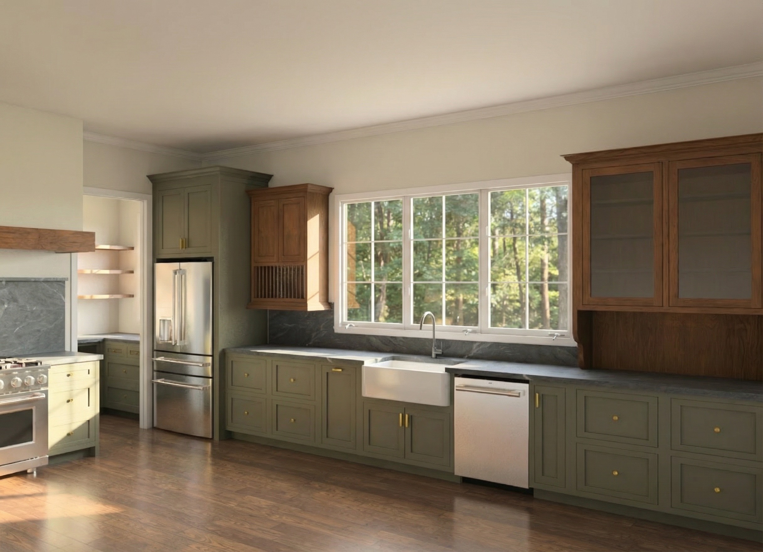 add plates in the plate rack and cups and bowls in the glass door hutch cabinet