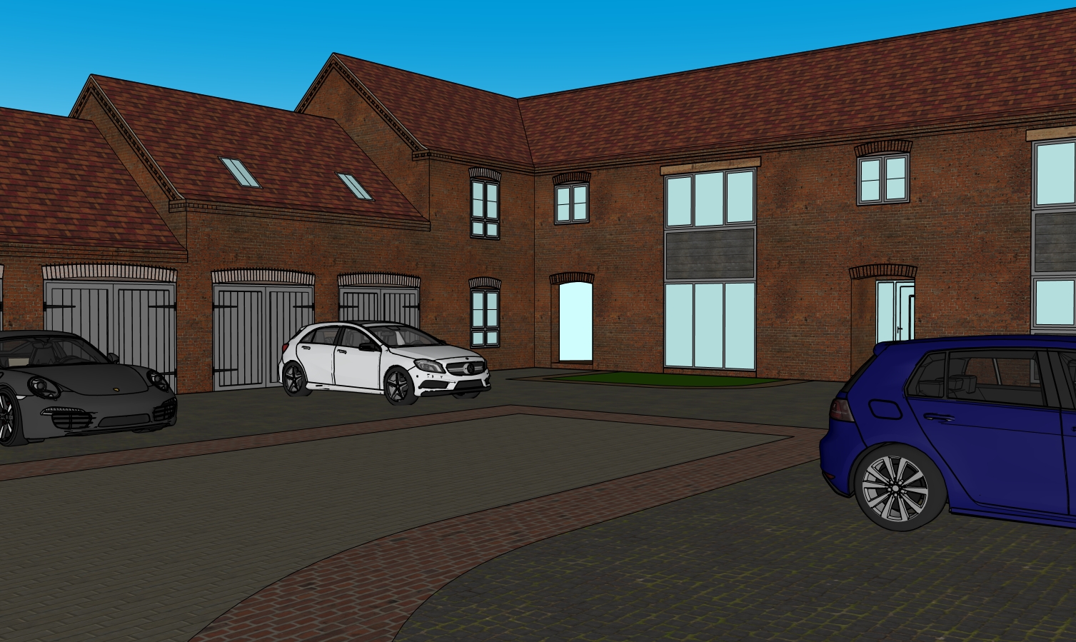 create an artist imperssion to the small grassed area in front of the window light grey windows and doors light rustic red roof pan tiles light cloudy sky summer golden hour maintain shapes dont change lines