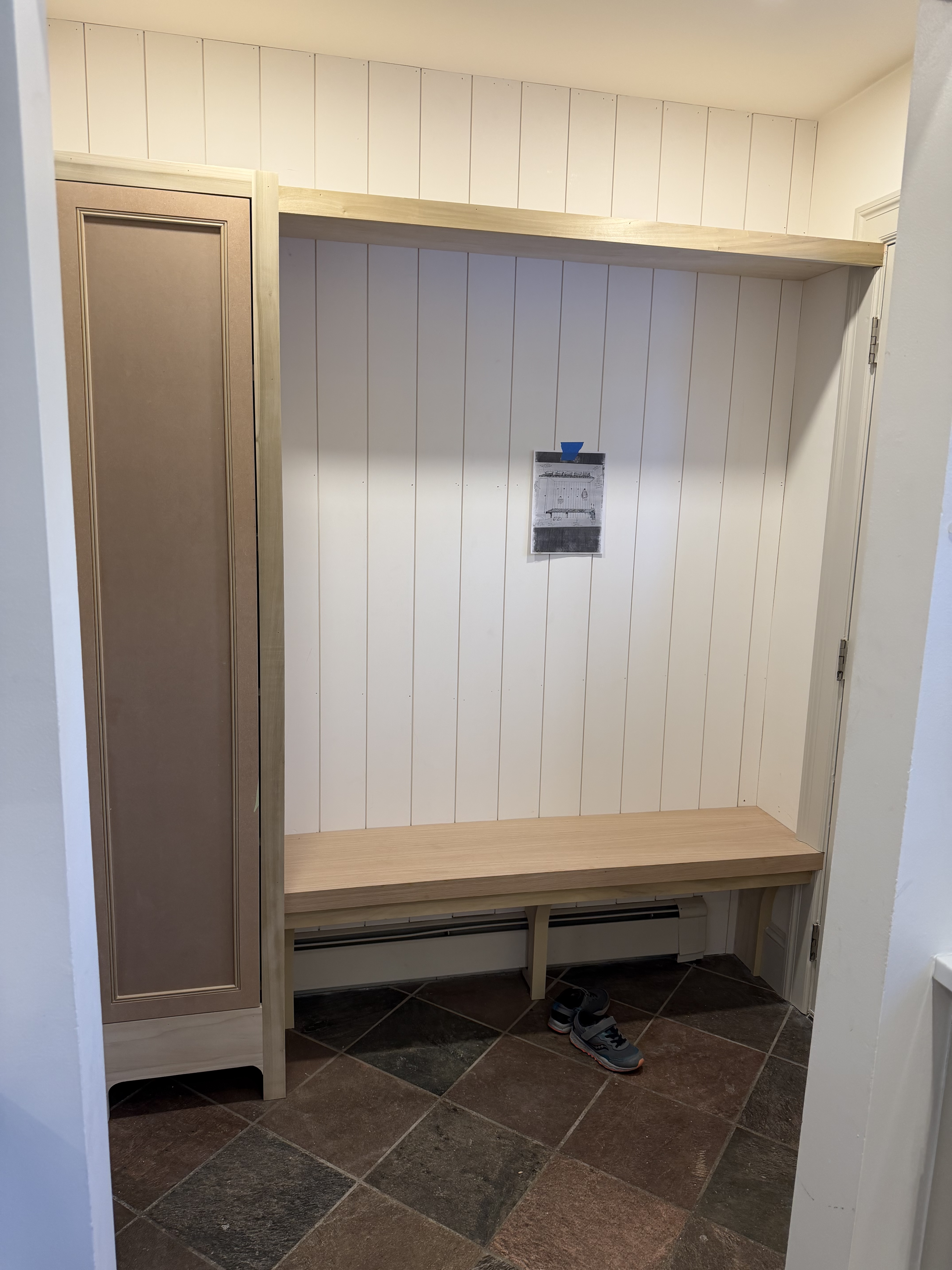 remove the paper on the wall put 4 brass hooks on the wall paint the cabinetry a sage green