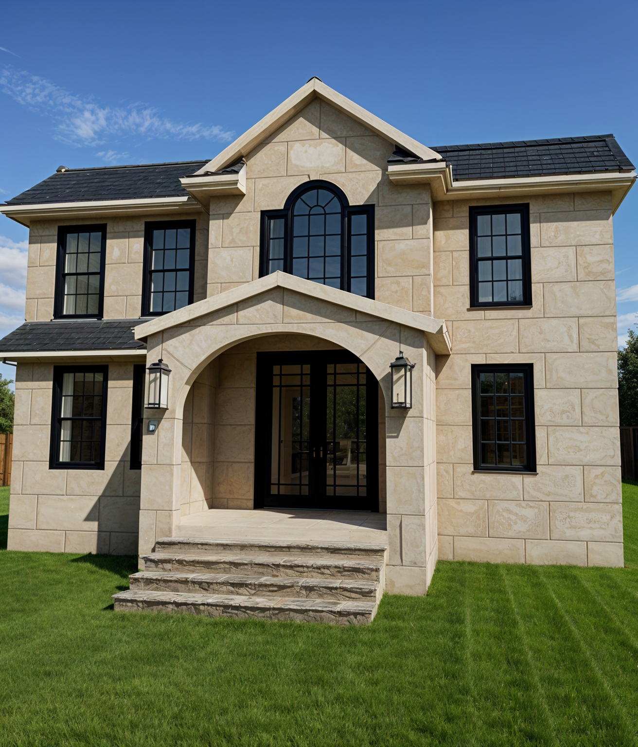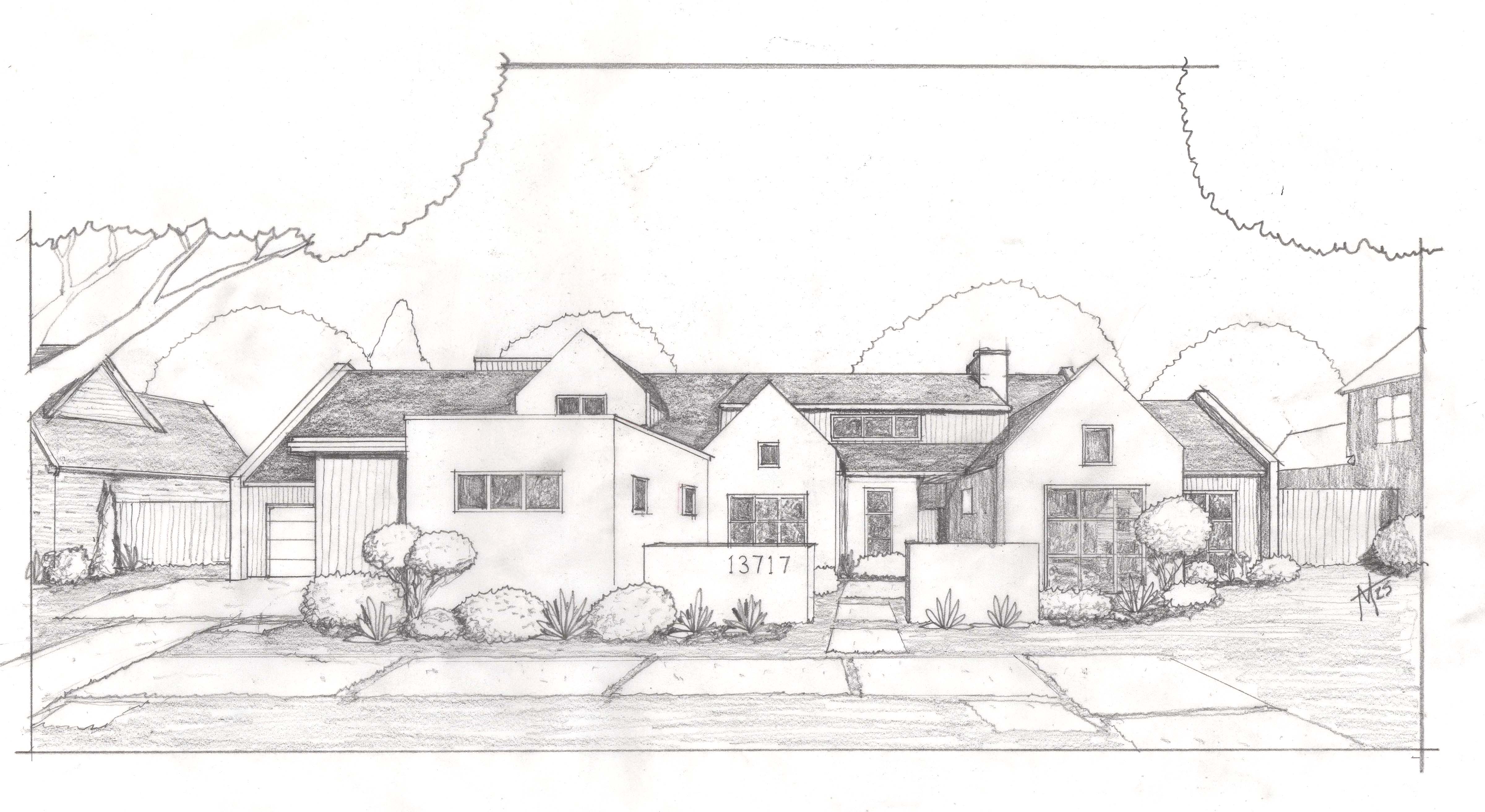 all gables have a parapet cap primary material is white stucco secondary material is dark grey vertical siding window are black frame steel eave are dark grey to match the siding roof is composition shingles garage door is black to match windows