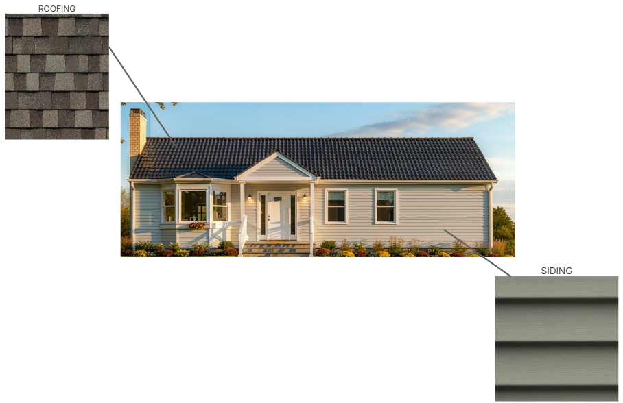 change the siding to horizontal lap siding in the exact color and texture shown in the reference cool light gray tone ensure clean horizontal lines with subtle shadowing between boards replace the roof with asphalt shingles matching the reference image multi tone gray brown dimensional shingles maintain realistic material textures and proportions do not change the house structure windows trim or lighting