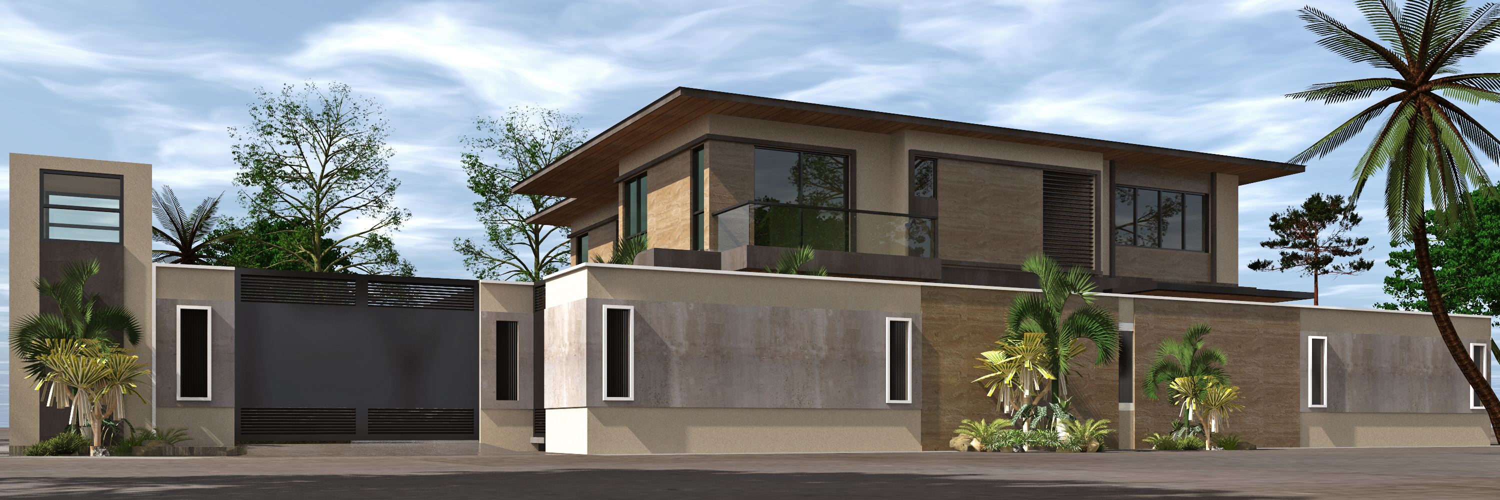 modernist exterior shot render a modern two story villa surrounded by tropical trees and plants the villa features beige concrete walls large dark windows and a wooden slanted roof the gate is sleek and dark gray complementing the structure the sky is bright and slightly cloudy creating a sunny serene atmosphere add lush green palm trees and vibrant landscaping to enhance the tropical ambiance the overall mood is luxurious and tranquil with an emphasis on natural tones and elegant design architecture