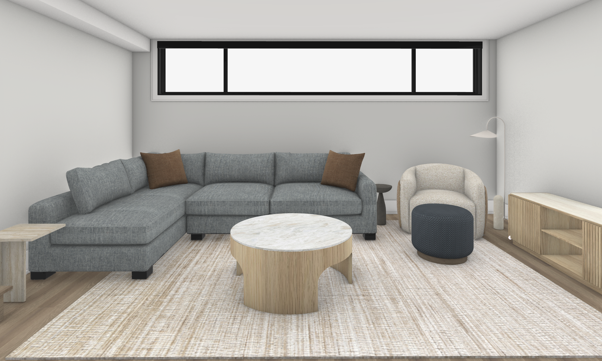 natural lighting light wood tones add a background with top of the trees showing add a tv above media unit and add accessories to coffee table and shelves and small side table add a thin 1 4 thick white travertine top to media unit