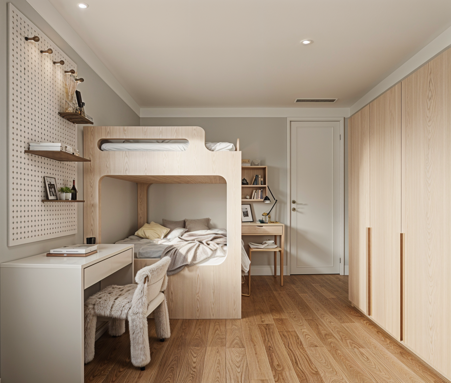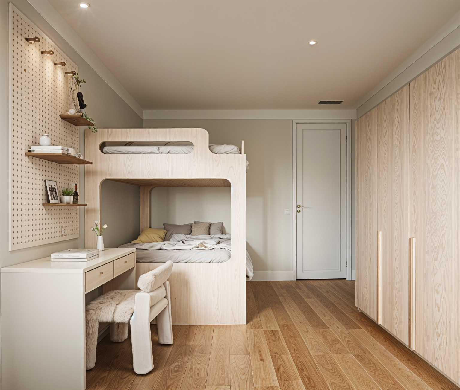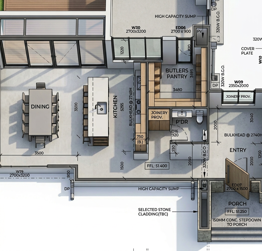 photorealistic render of a luxurious kitchen with cabinets in soft grey colour and countertop and walls in white calcutta marble the kitchen door has white door frame with inset reeded glass texture the whole ambience is bright and clean and minimalistic