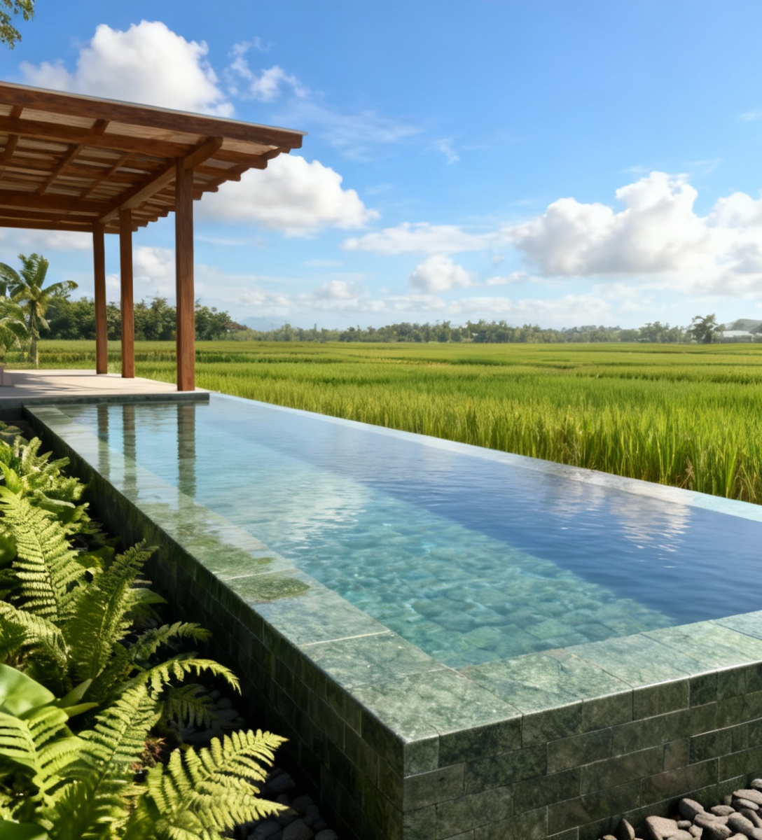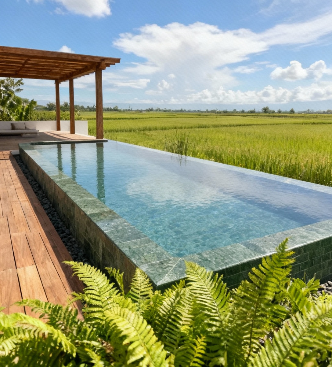 change all landscape to ricefields remove all trees to make ricefields until the horizon and under beautiful blue summer sky with white clouds the pool is clad with bali green andesite remove the white wall in the background and make it a timber pergola pavilion plants immediately near the pool are lush ferns in the foreground and wooden deck on the left that is level with the top of the pool the perspective is maintained same as the reference image