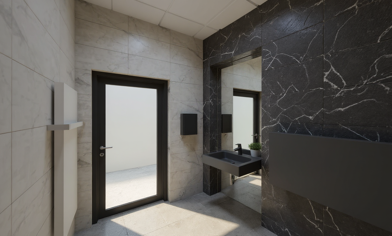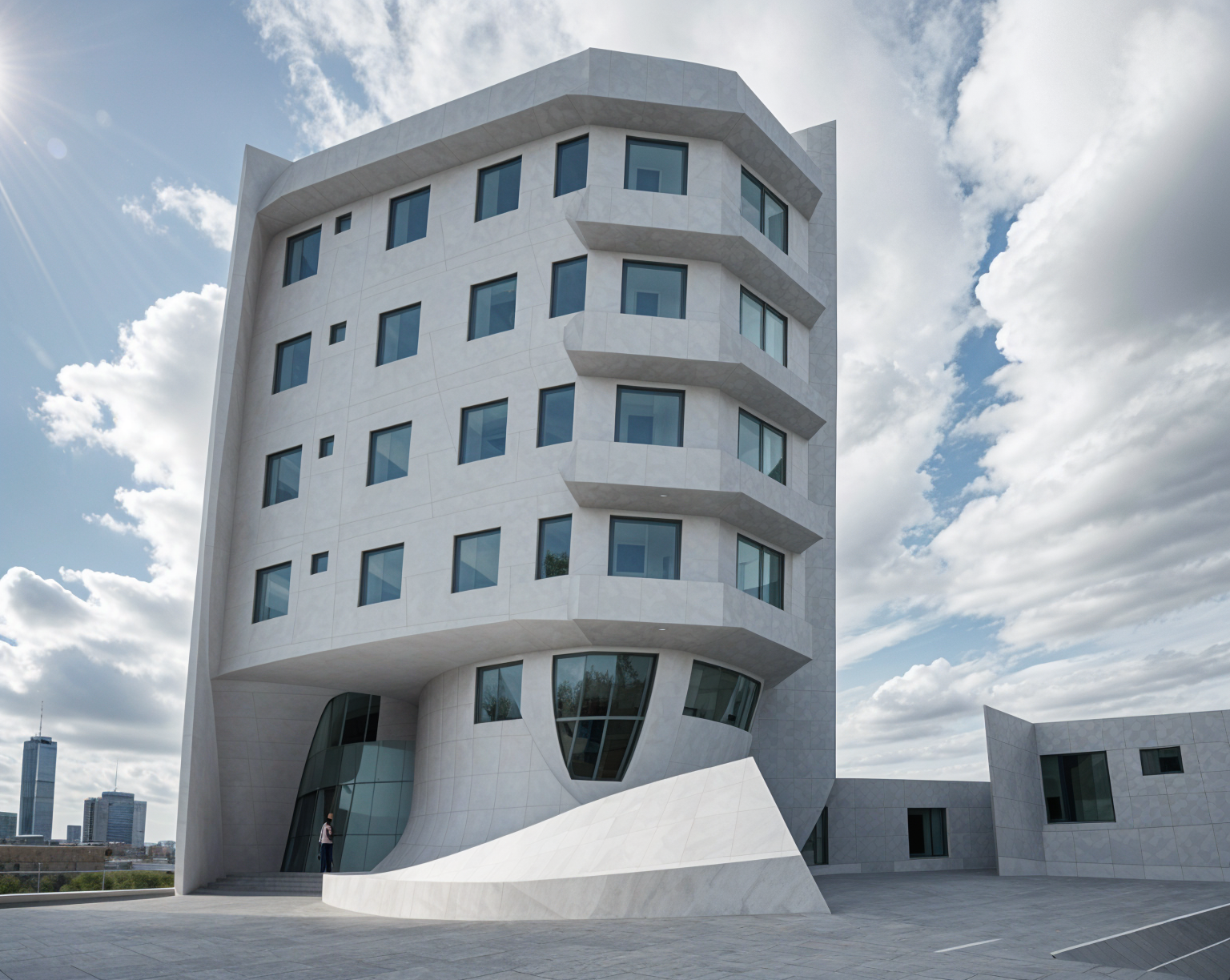 bobby mcalpine exterior shot a modern five story building with a minimalist design featuring clean sharp lines and large black framed windows the building is painted in a pristine white contrasting against a vibrant blue sky dotted with fluffy white clouds the sunlight casts soft shadows across the structure enhancing its geometric form at the base of the building a small neatly paved area surrounds the entrance the atmosphere is peaceful and serene with a feeling of a bright sunny afternoon surrounding buildings are minimal blending harmoniously with the environment architecture