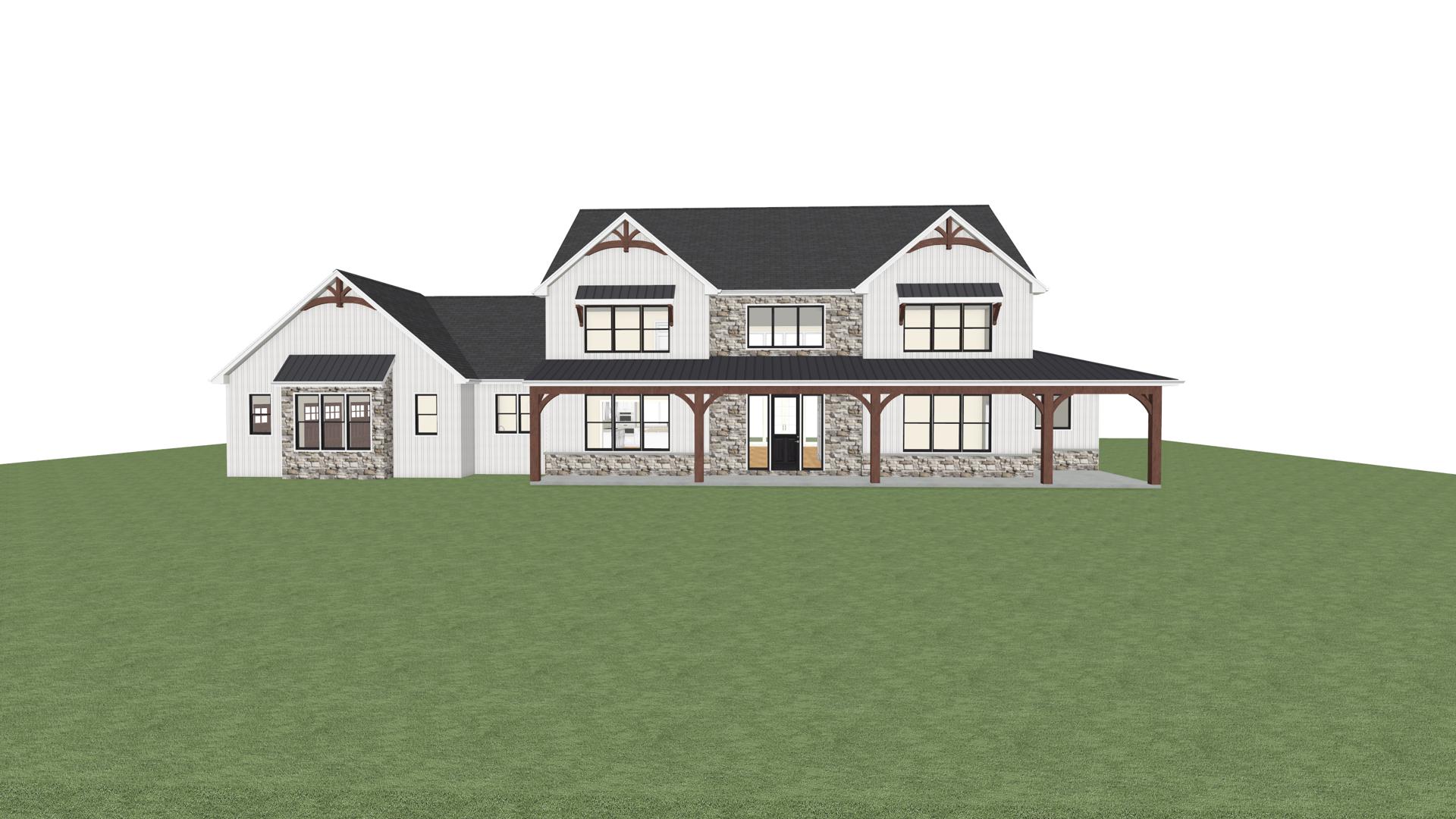 photo realistic of timber frame building with reclaimed white siding and black window trim and stone wainscot watercolor trees and farm environment in the background extensive watercolor landscaping surrounding the building