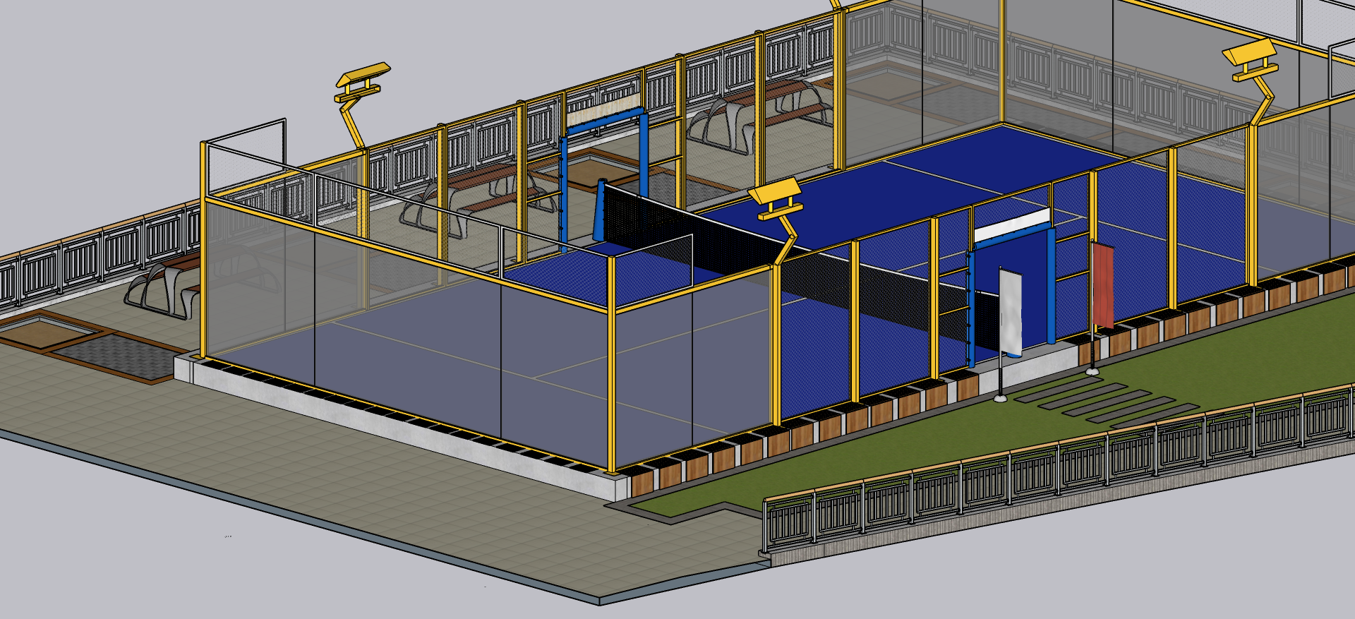 photorealistic architectural render of a modern outdoor paddle court keep exact geometry and original material colors from the model yellow powder coated steel structure with subtle micro roughness and soft light reflection not glossy tempered glass enclosure panels with accurate transparency soft sky reflections realistic edge tint slight smudging and reflection distortion blue synthetic paddle court surface with visible turf fiber texture slight tonal variation crisp white line markings subtle rubber infill depth black woven mesh net with realistic tension and fine fabric detail wooden base cladding enhanced with natural wood grain texture visible knots and fiber direction warm medium brown tone satin finish realistic plank joints and depth shadowing concrete base with fine aggregate texture subtle surface imperfections and soft weathering surrounding pavement tiles with visible joints and slight color variation realistic grass with natural density variation and soft edge blending natural daylight late afternoon warm sunlight soft long shadows global illumination ambient occlusion hdri sky lighting physically accurate reflections architectural camera from corner perspective eye level 35mm lens balanced exposure realistic color grading high detail 4k resolution not stylized not cartoon not over saturated show concrete texture between wood
