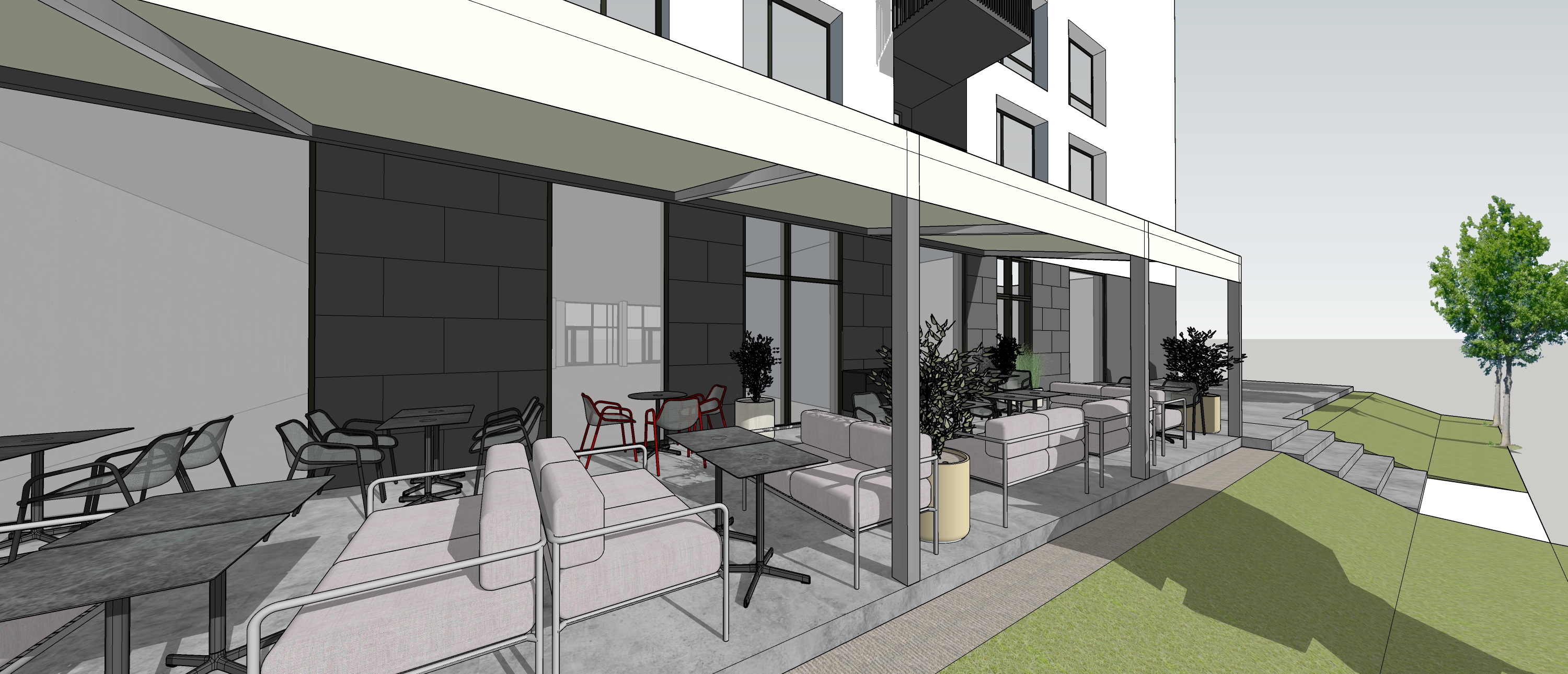 urban terrace caf stylish outdoor furniture natural human scale cozy atmosphere day hour lighting warm ambient lights realistic shadows lifestyle architectural photography