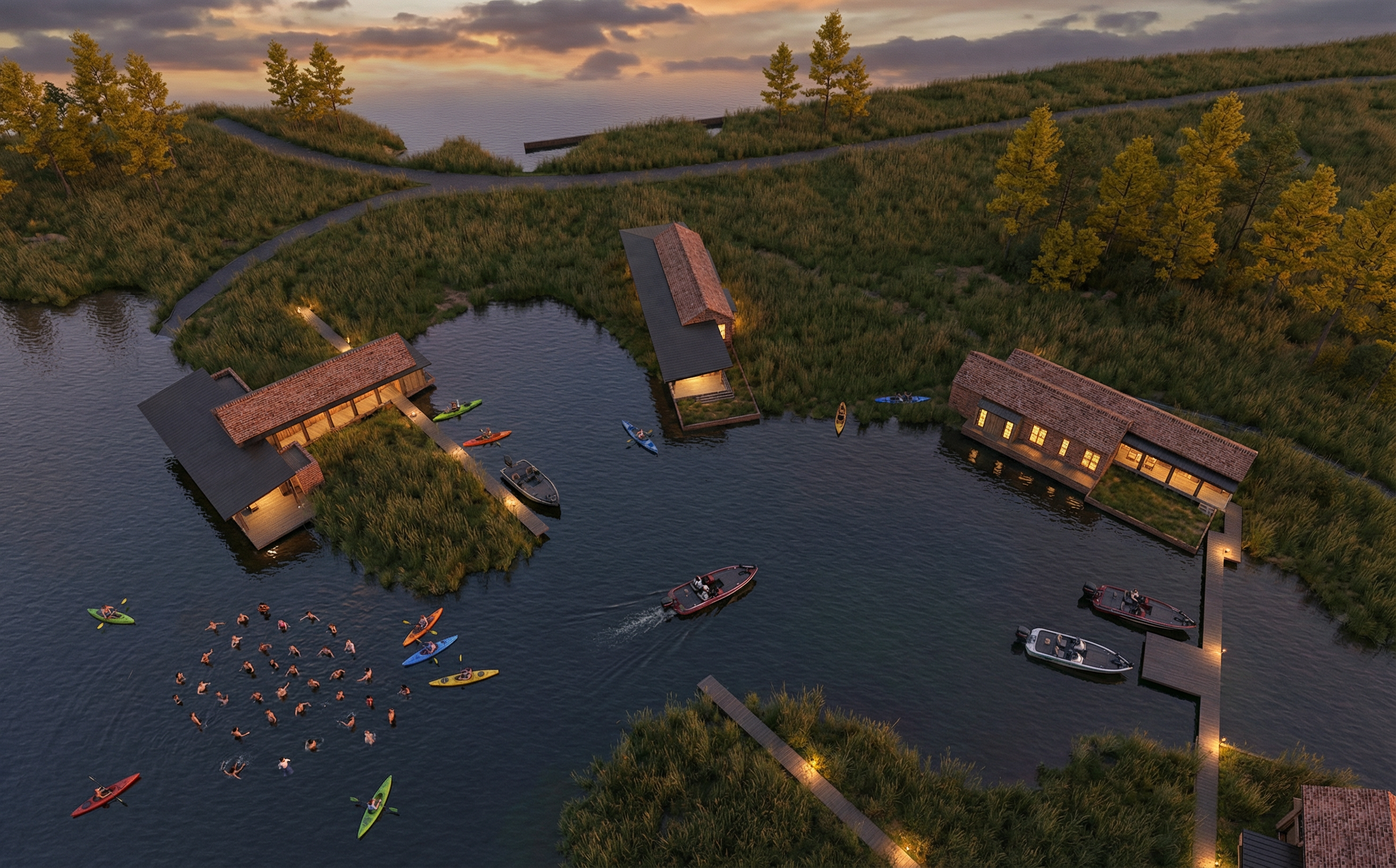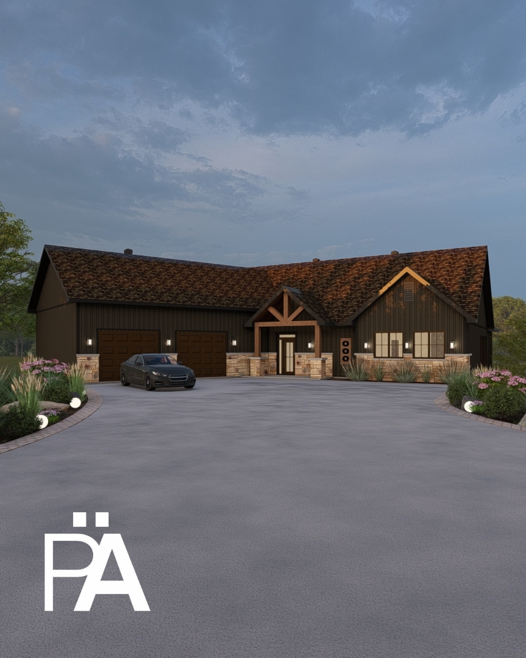 prairie style perspective shot i would like you to propose another version for the exterior cladding i would like it to be vertical maibec siding textured grooved clapboard in the color morning beige then for my masonry i would go with select stone supply in the model cotsworld rockcliffe blend in the color random ashlar i would like it to be in a landscape surrounded by trees and include a beautiful landscaping with perennials there should be an asphalt driveway in front of the main door and the garage doors i want a realistic rendering with beautiful natural light and an after rain effect architecture