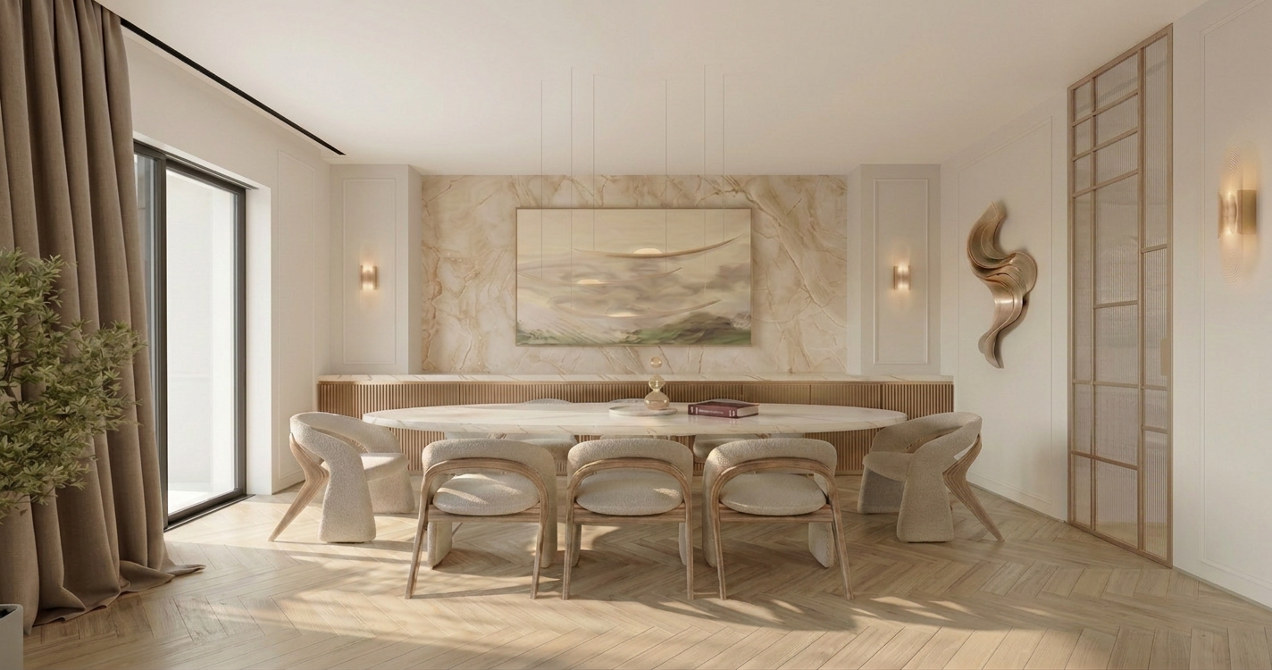 render a cozy living room with soft natural lighting include a beige sectional sofa with earth toned throw pillows adjacent to a slatted wooden partition use a light wood finish for the floor and partition adding a plush beige rug showcase an elegant cream colored curtain on a large window with an inviting fireplace surrounded by white brick place minimalist art on the walls in simple black frames add a well lit airy atmosphere emphasizing warmth and comfort throughout the room