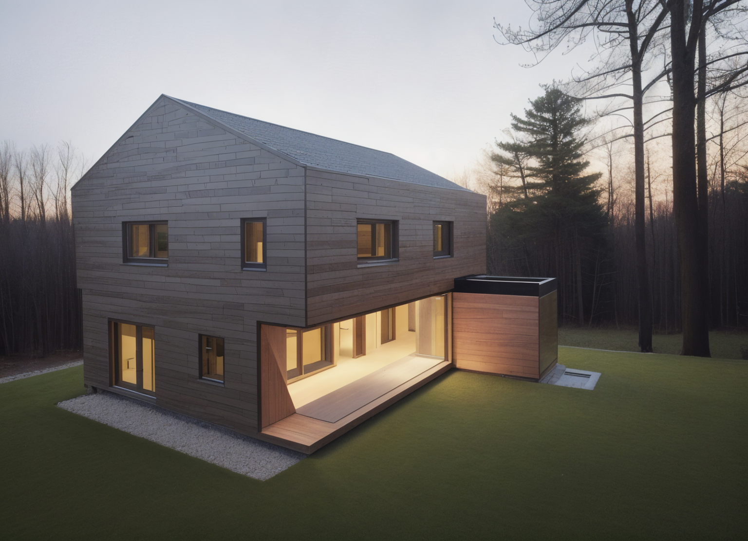 bobby mcalpine exterior shot 3d rendering of a modern house with minimalist design smooth white walls and large glass windows the roof is a sleek grey color with a subtle texture the sky is a gradient of soft blue transitioning to light grey at the horizon add ambient lighting to enhance shadows and highlights creating a serene and inviting atmosphere architecture