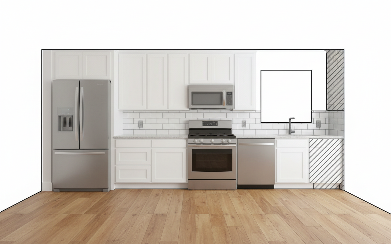 the island and the arch on the left side need to be in wood in my selection baseboard on the right side need to be the same color as the wall and the door on the right side need to be black not brown