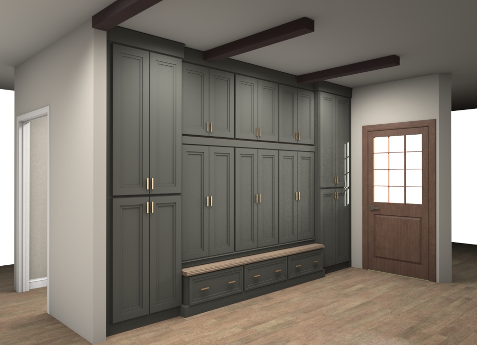 create realistic image of this mud room rendering do not alter layout or details