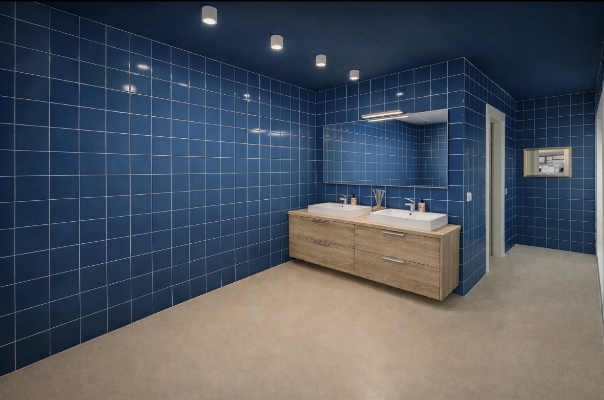 move the sink on the other wall and change tiles with a blue wall