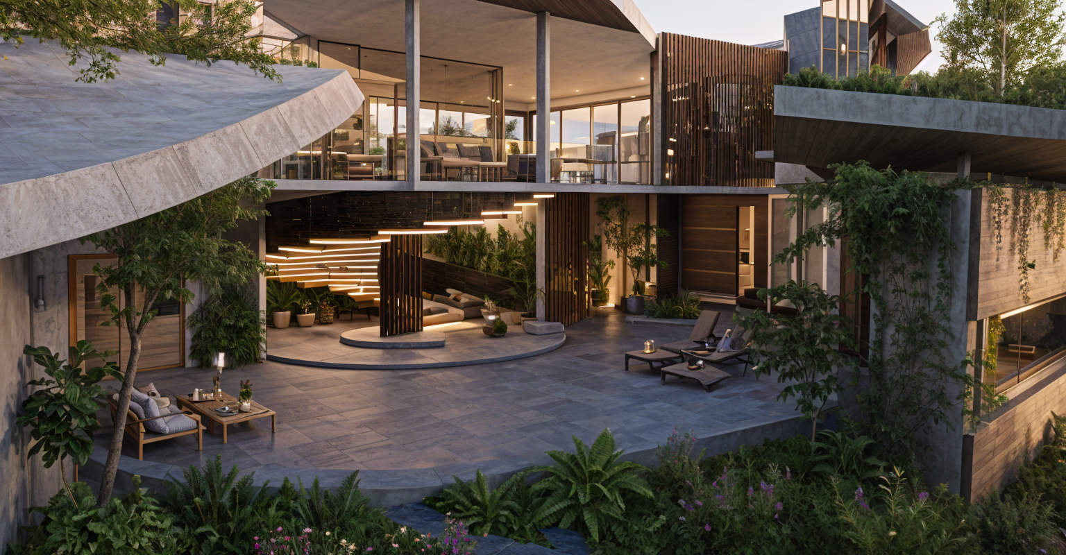 modernist perspective shot use nature material wood stone concrete coziness and greenery set in the evening with soft gentle sunlight put a stair in the middle circular make it a community center architecture