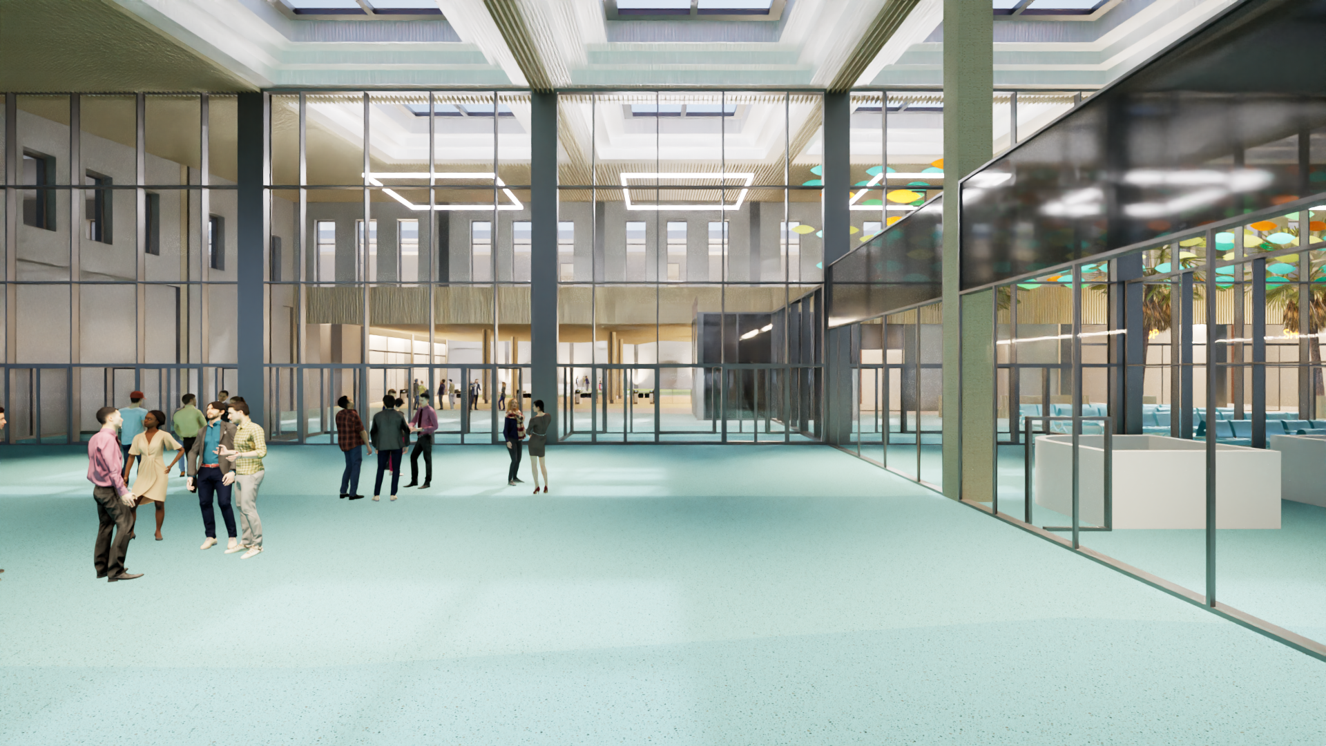 a stunning modern ferry terminal on the water featuring a sleek white roof with integrated solar panels contrasted by bold red letters spelling zanzibar ferry the terminal is surrounded by transparent blue glass walls allowing a serene view of the calm rippling azure water reflecting the structure the atmosphere is bright and inviting with a clear sky and soft fluffy clouds lush green palm trees line the rear of the terminal adjacent to minimalistic white geometric buildings capture the vibrant tropical vibe with a sense of tranquility and luxury
