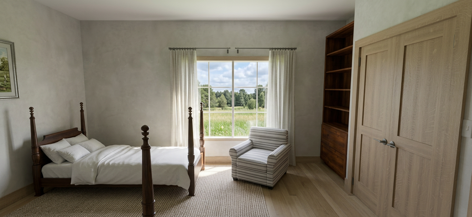 add sage green art above the bed the wall behind the bed must remain white add recessed spotligts on the false ceiling of the wall on the left and above the wooden sliding doors of the closet warm lights scandinavian vibes