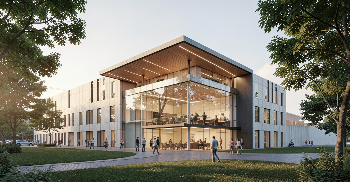 tilt up concrete architeture facade add people and trees 2 story lobby 3rd floor has a patio with wood ceiling with linear lighting