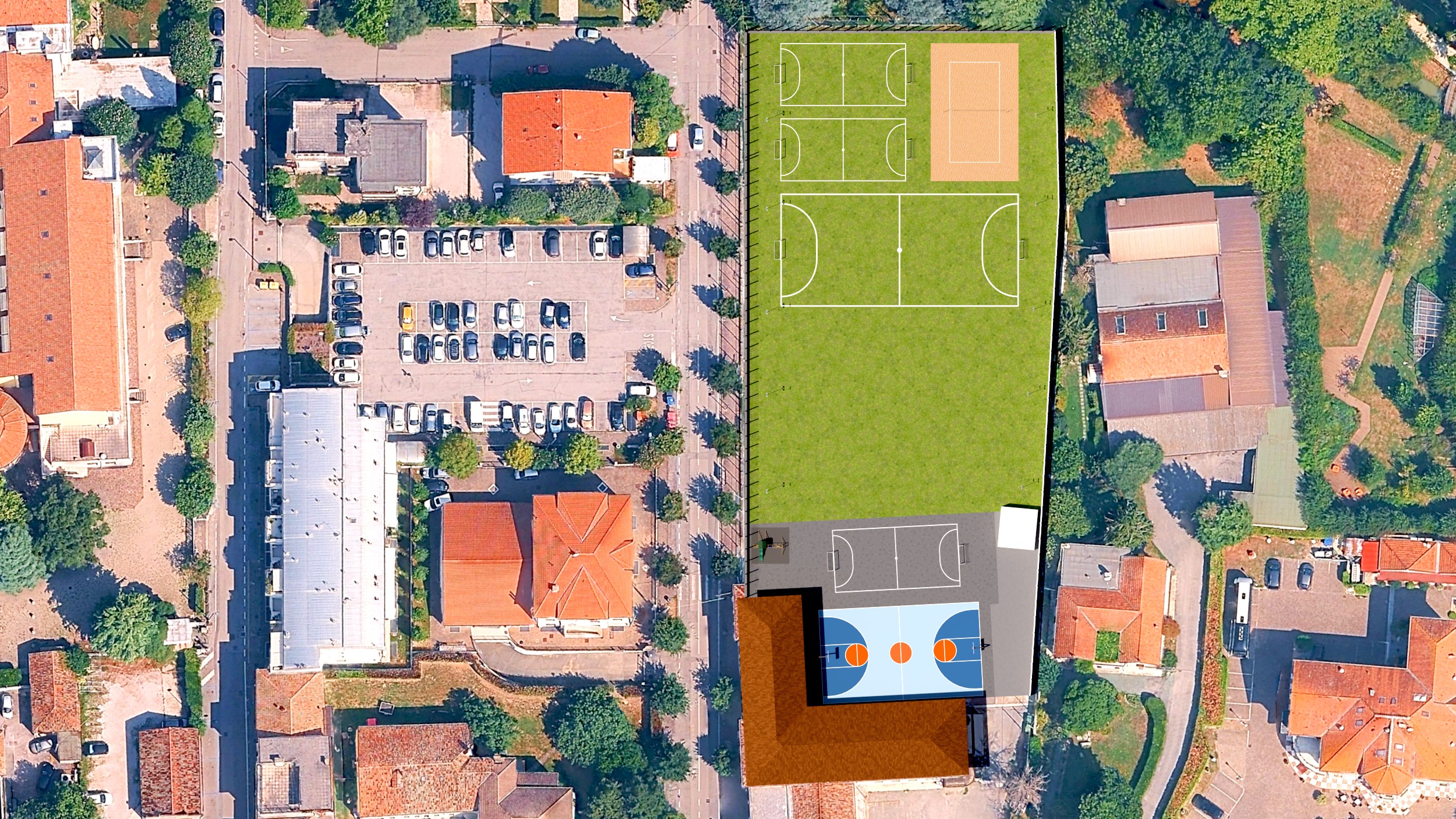 ultra realistic aerial satellite view of a modern sports complex similar to google earth imagery bird s eye perspective showing several soccer fields with bright green grass and crisp white field markings center circle penalty areas goals clearly visible and multiple beach volleyball courts with bright white sand and nets the fields are arranged in an organized layout and clearly stand out from the surroundings surrounding urban context with streets residential buildings parking areas trees and pedestrian paths high resolution satellite style strong contrast between grass and sand surfaces sharp field lines realistic shadows accurate scale photorealistic textures ultra detailed 8k resolution satellite imagery style