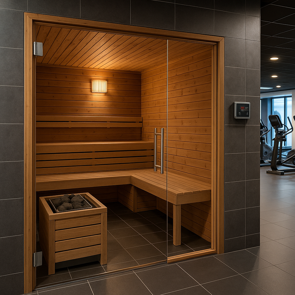 add a woman inn gym cloyhing sitting down sweating inside de sauna