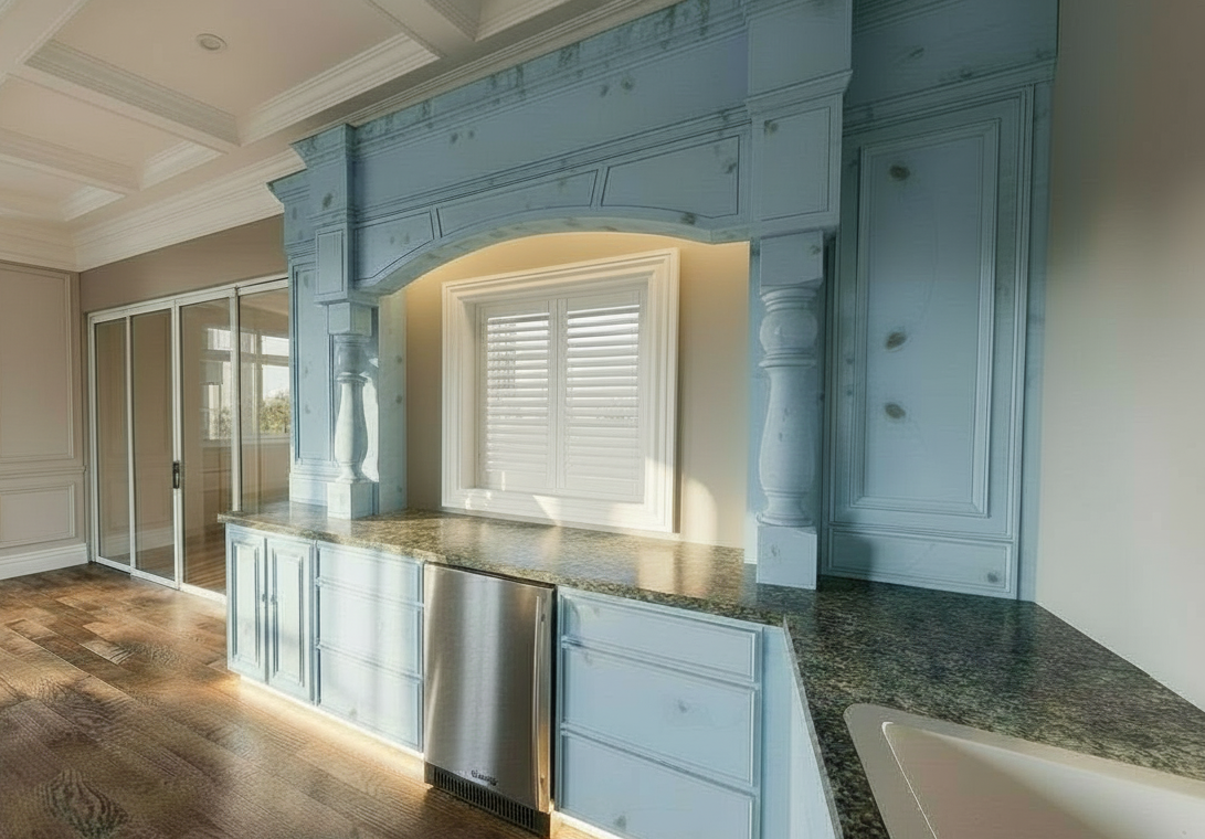 a beautifully rendered luxurious kitchen interior with pale blue painted cabinetry featuring intricate detailing and bronze hardware highlight the elegant arch and carved columns in soft sky blue use a polished granite countertop in soft white tones with specks of warm gray incorporate a sleek wine cooler showcase sliding glass doors with white louvers and with white frames allowing soft natural light to flood the room the walls are painted in a warm beige creating a cozy inviting atmosphere the floor is made of rich wooden planks in a blend of warm warm chocolate hues enhancing the room s warm and elegant ambiance