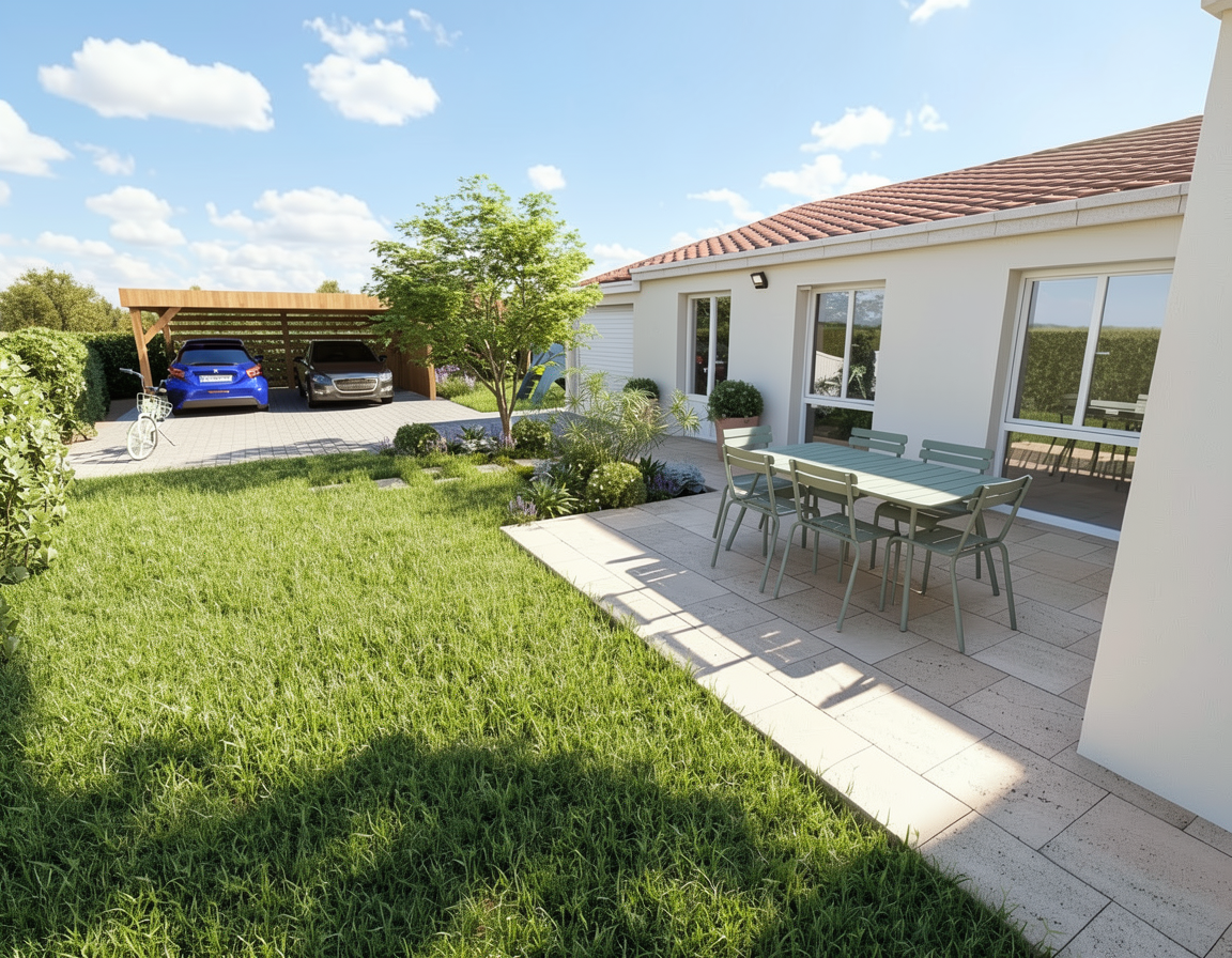 model of a house add few trees in background to give it context add very very few vegetation with some floral ones i want a sunsety 3 4 p m vibe make the horizontal lines on upper walls light brown and very thin they should only be 4 of them