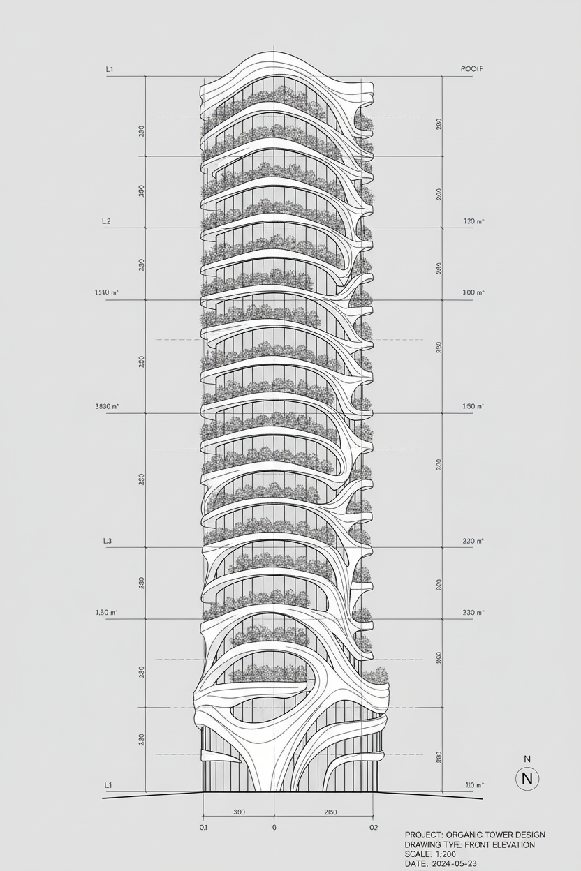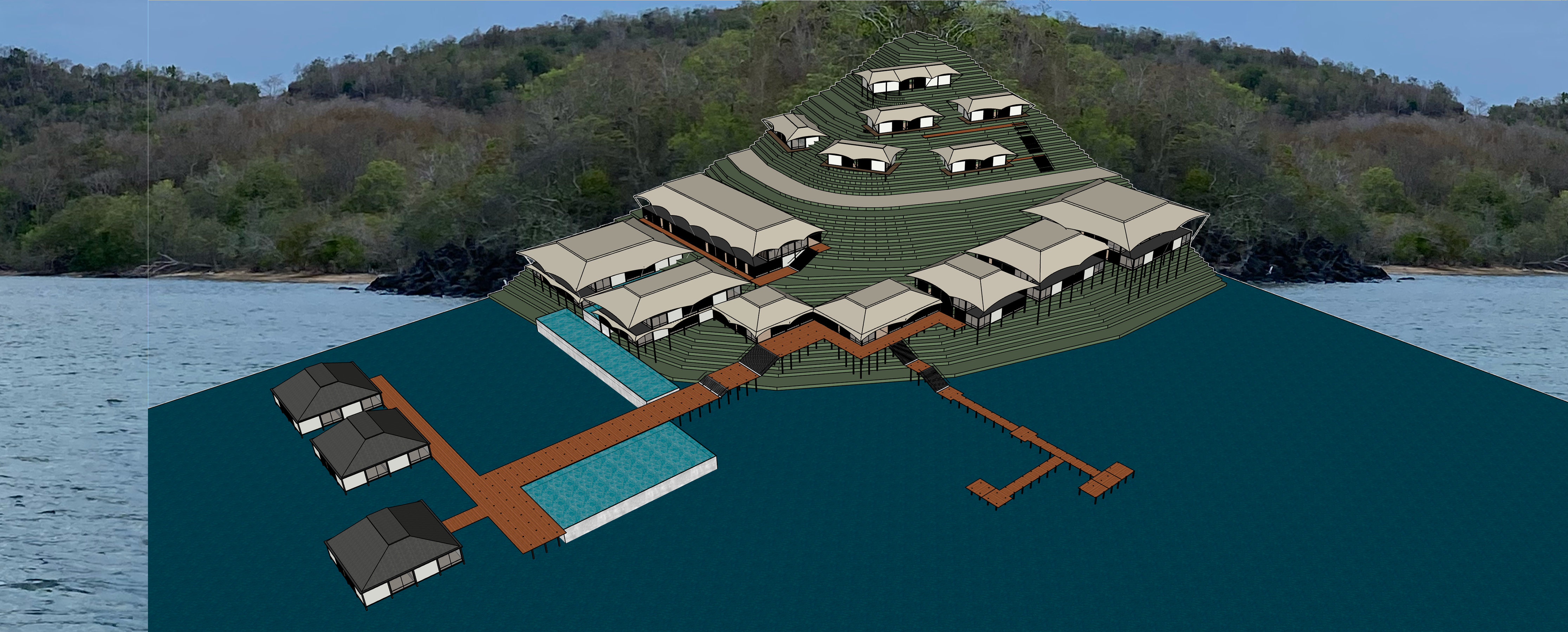 render the existing raw 3d drawing from a low aerial angle positioned just above the sea surface looking slightly upward toward the building complex do not modify any elements of the original 3d model enhance the coastal neighborhood setting with tent roof buildings surrounded by trees and vegetation show the cliff forest behind the main structure rising along the hillside in the foreground render the sea with the jetty extending toward the complex apply warm coastal lighting and maintain the authentic labuan bajo atmosphere