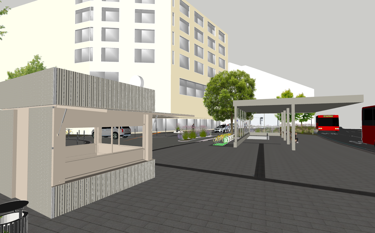 ultra realistic architectural visualization of a sketchup 3d kiosk model with a shelter awning preserve the exact geometry and proportions of the model critical color lock must follow exactly the middle body of the kiosk must be rendered in ral 080 80 10 with no deviation this is a fixed non negotiable color the top and bottom parts of the kiosk must be corrugated metal in ral 7044 with the same exact color preserved the shelter awning must also be corrugated metal in ral 7044 identical to the kiosk top bottom parts do not reinterpret approximate lighten darken desaturate or color shift these ral values under any circumstances the renderer must treat these colors as absolute and physically accurate references material definitions middle kiosk body smooth plastic pvc abs slightly glossy physically based material but color must remain exactly ral 080 80 10 top bottom kiosk shelter corrugated sheet metal with visible wave profile coated metal finish physically based reflections but color must remain exactly ral 7044