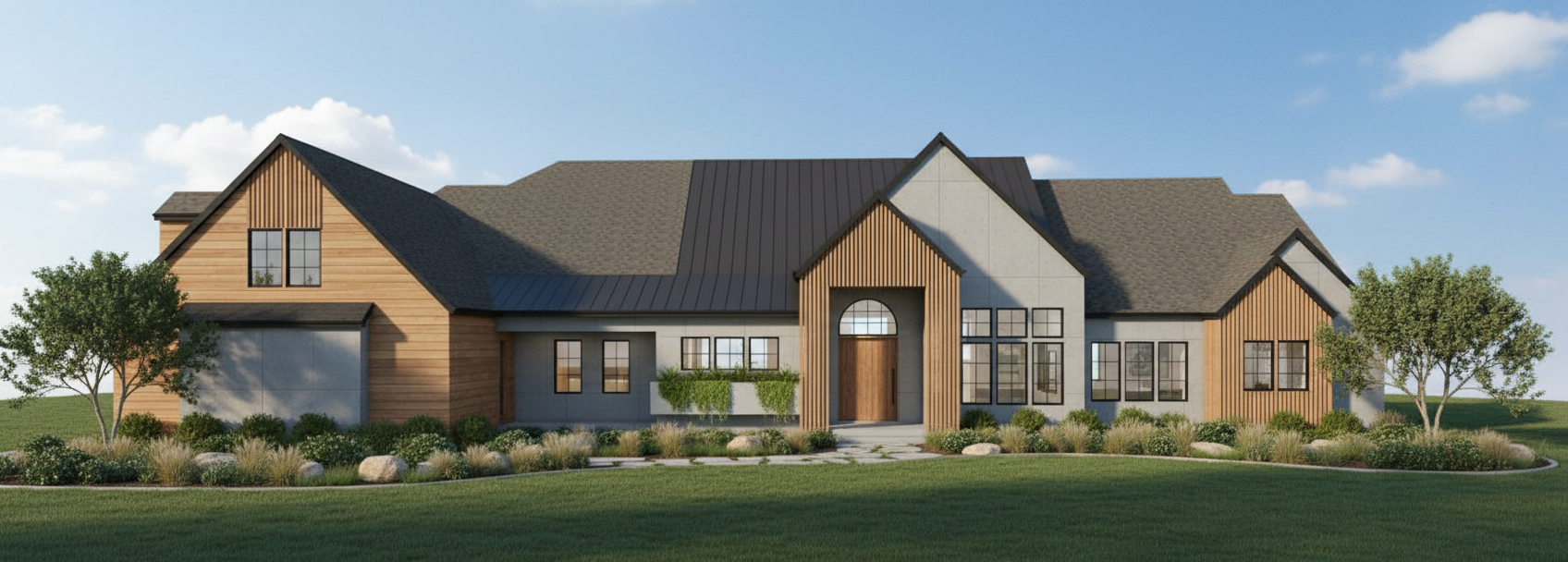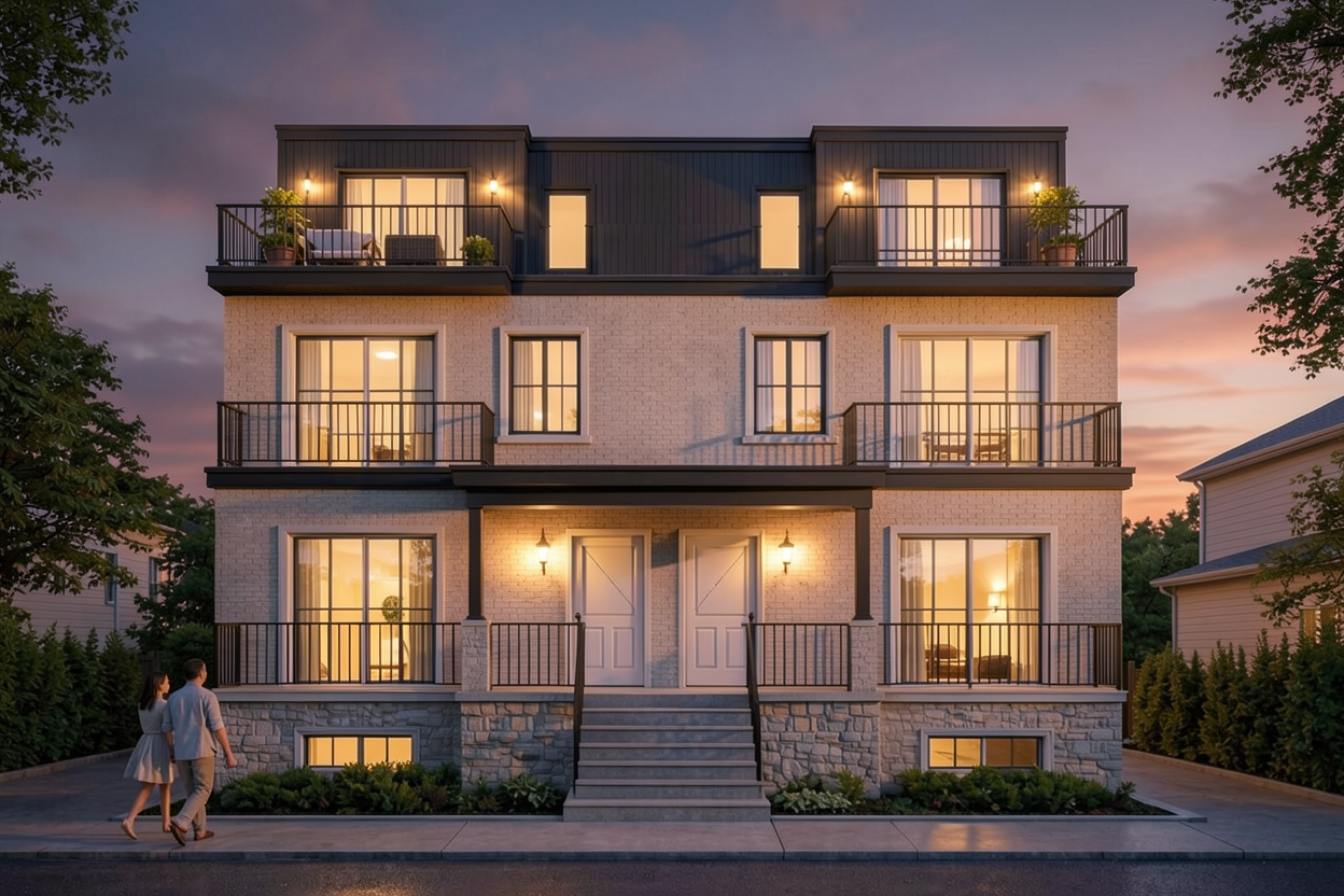 improve the photorealism of this image make it an evening scene make the entry doors dark finish