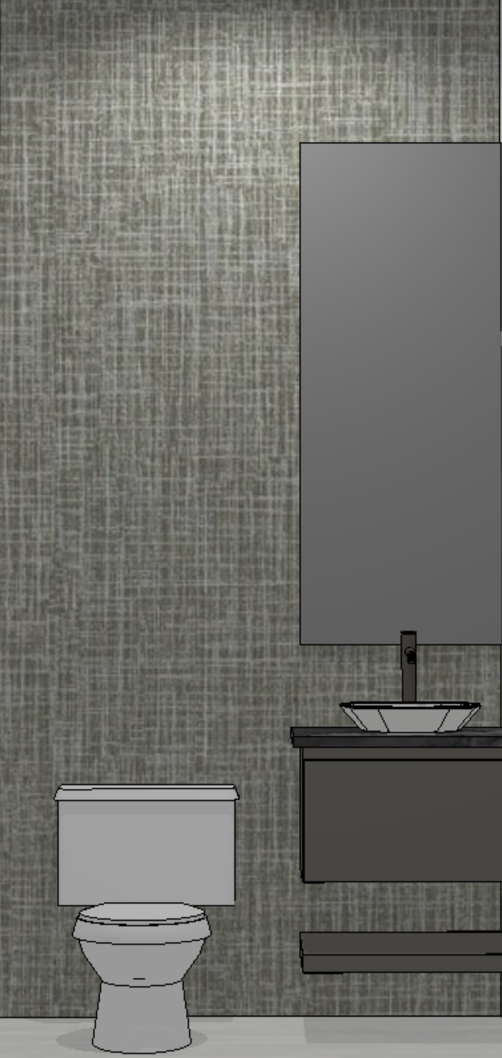 change toilet to a one piece change floor to a polished white porcelain add a little sheen to the cabinet color add 3 rolled towels on the shelf for decor