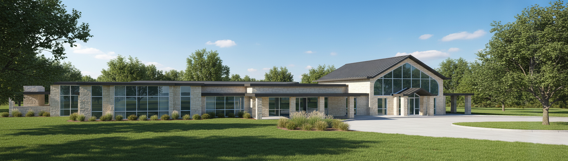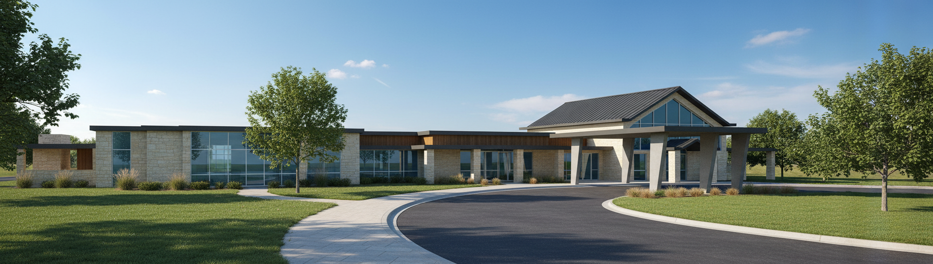create a rendering of this park shelter with a ball field in front of it green grass and a walkway with a valley of woods and trees behind it