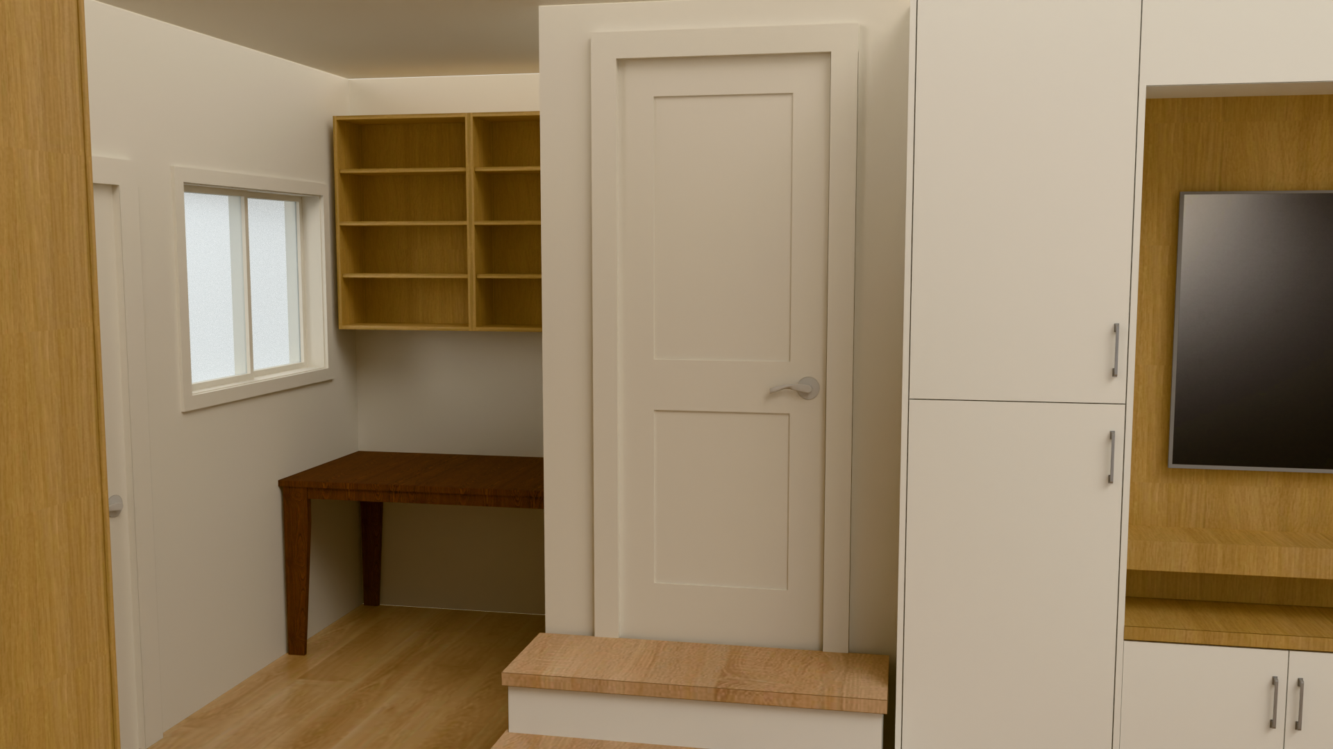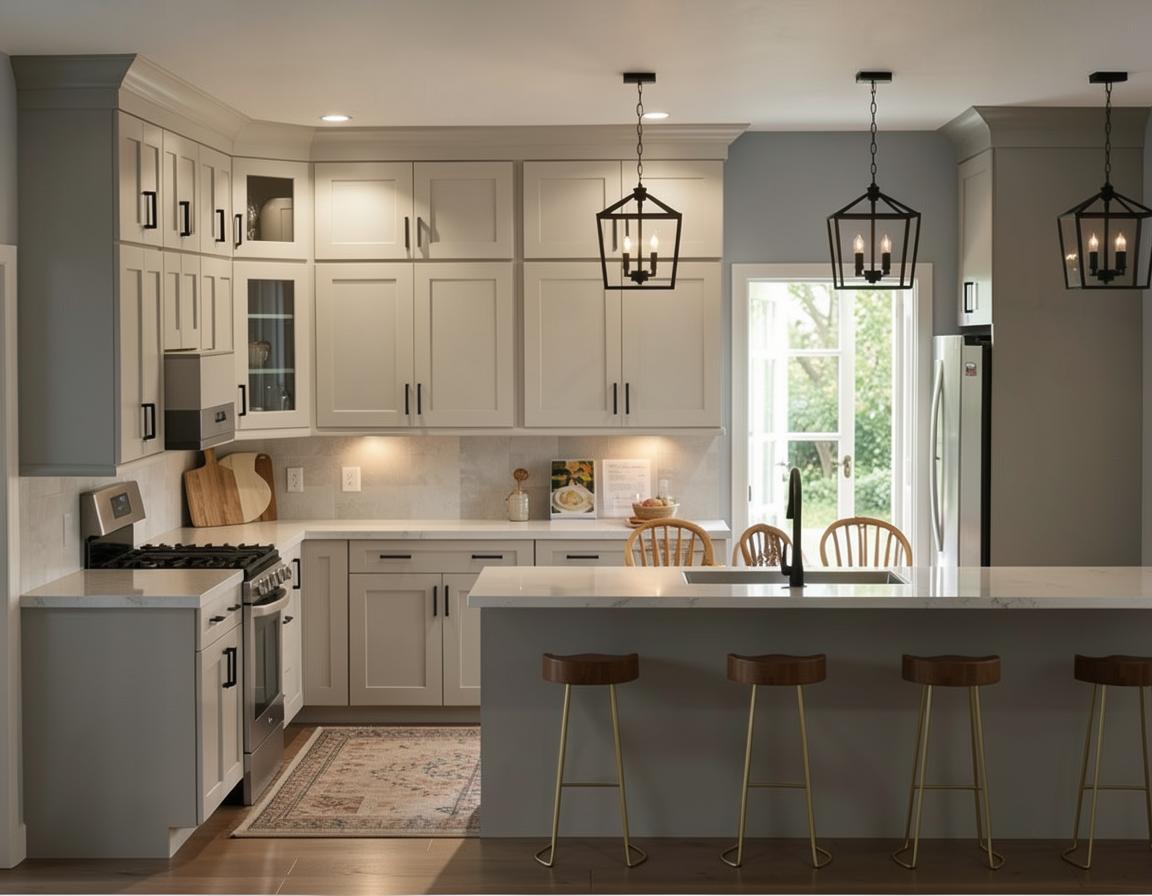 enhance photorealism remove light glow above cabinets increase overall brightness slightly