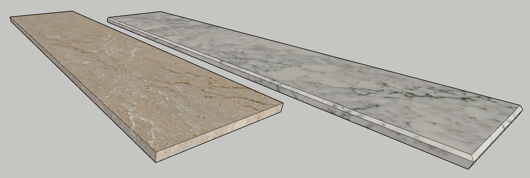 create a photo realistic render of these two tiles sitting on a neutral wood tabletop with a tight enough shot to identify the difference in the egde profiles while preserving all stone design and color characteristic with very subtle soft natural lighting the first sample has a straight edge and the lighter marble look has a subtle chamfer edge
