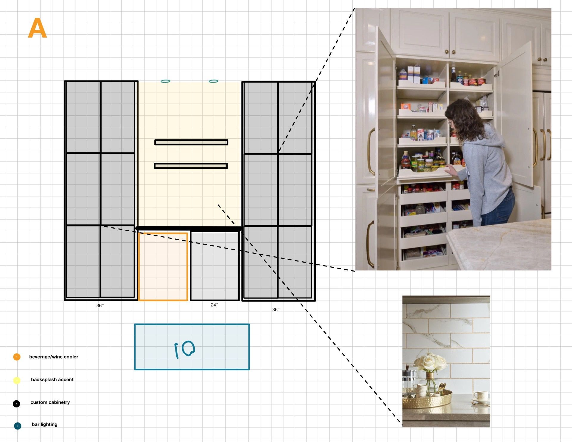 use this sketch to create a kitchen wall rendering countertops are white quartz full tile backsplash up the wall in the middle with floating shelves the orange shape on the left is a wine beverage cooler the grey shape in the center on the right is a single base cabinet make one of the full height cabinets have open doors with pill out pantry shelves like in the image full height cabinets and base cabinets in a light stain grade