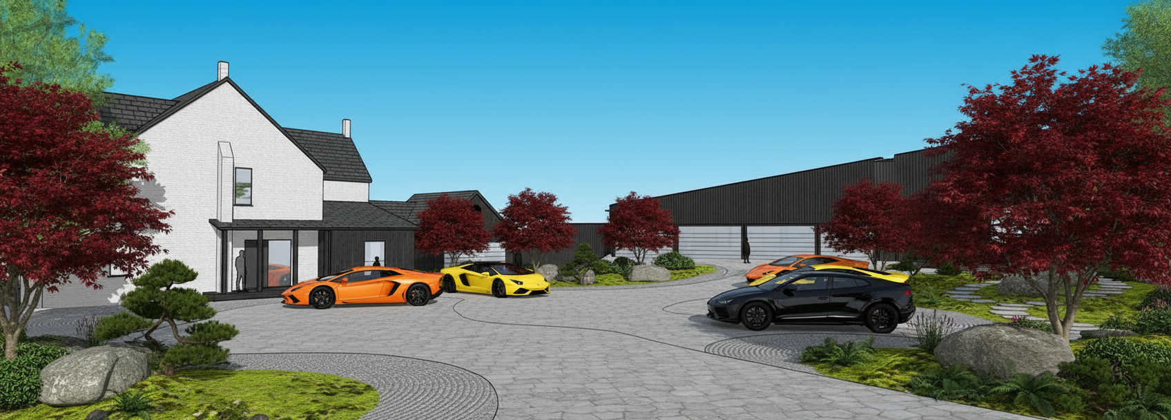 change the time of day to dusk keep the general direction of natural light keep the colors of the painting the same add some moody modern dark lounge chairs far away from the cabinets so that the cabinets are visible the 2 chairs should be the same style and facing each other super close to the camera lens keep the colors of the painting the same as the original photo